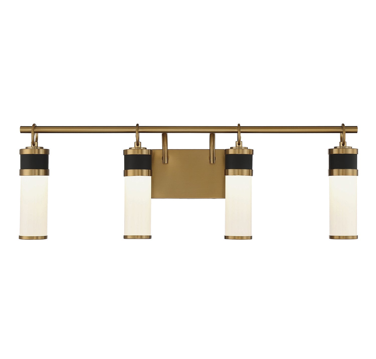 The Savoy House Abel 4-light bath vanity light flaunts a sleek and airy look that creates a robust presence in any space. Tubes of white opal glass are accentuated by ring accents and thoughtful hardware detailing in a rich combination of matte black with warm brass. Integrated LED light sources contribute to the sleek style. Abel is 10" in height, 30" in width and extends 5" from the wall. Damp area rated.