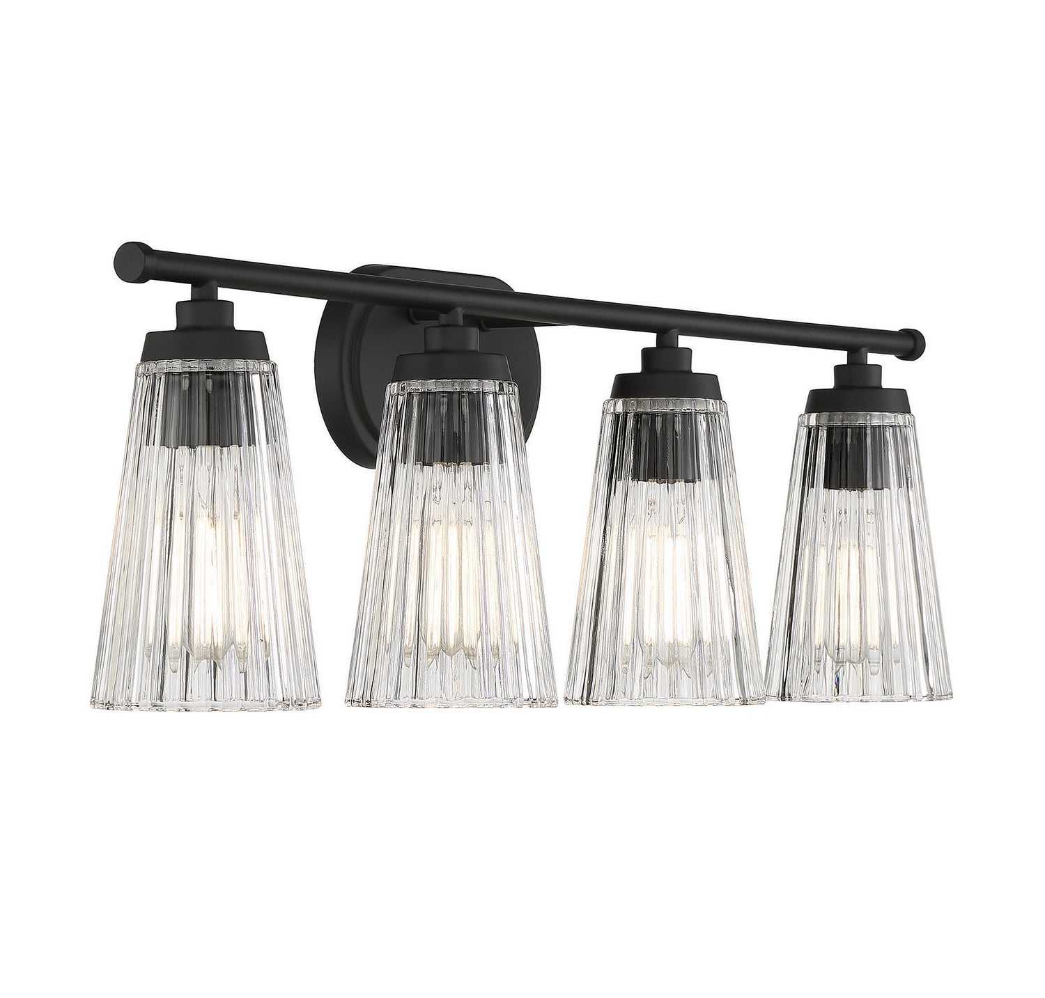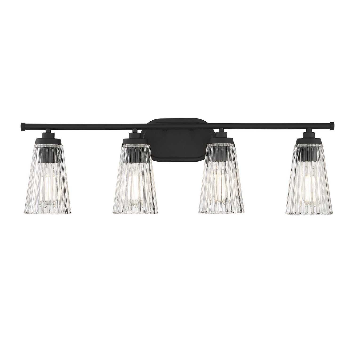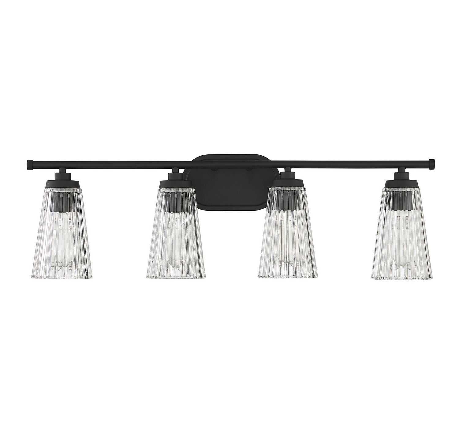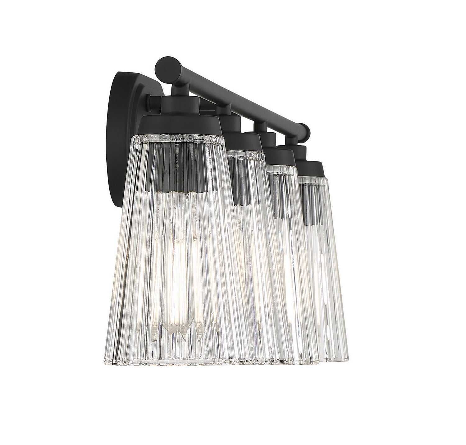 Textured, eye-catching shades of clear ribbed glass take center stage in the Chantilly 4-light bathroom vanity light from Savoy House. Finished in matte black. Chantilly is 10" in height and 30.5" in width. It extends 7" from the wall. Uses four standard size bulbs of up to 60 watts per bulb. Damp area rated.