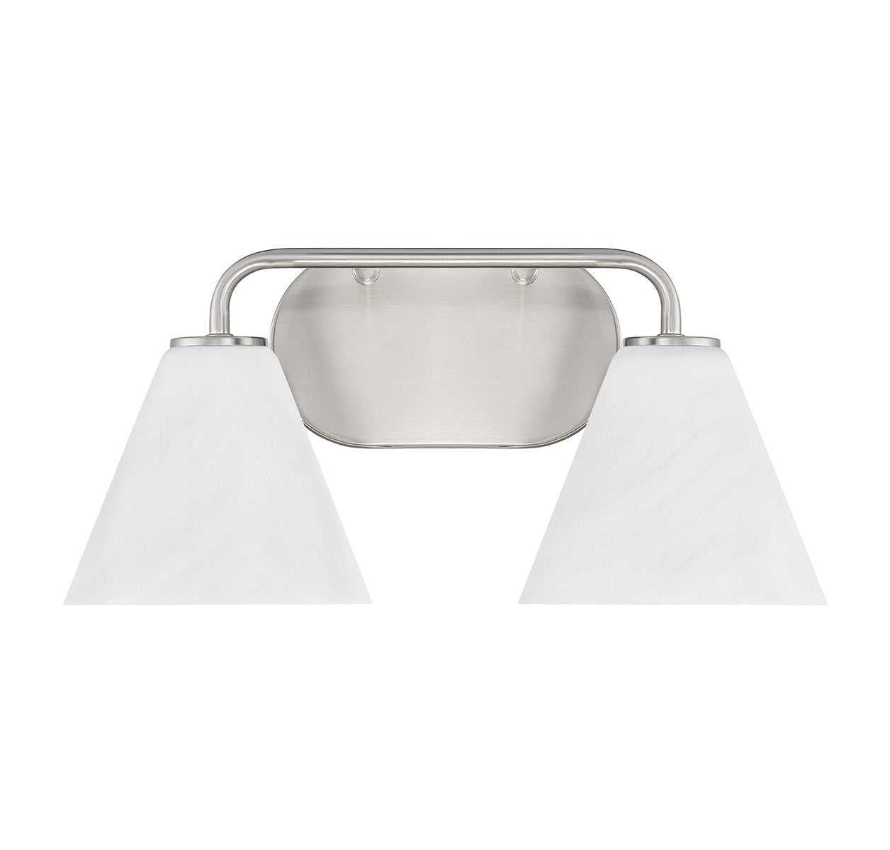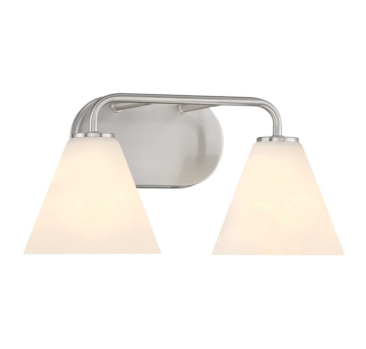 Get a warm and welcoming glow at the vanity with the Savoy House Blair 2-light bath light. Conical shades of white strie glass feature eye-catching wisps and swirls that add a touch of dimension and intrigue. The glass contrasts nicely with the versatile Satin Nickel finish. Blair is 8" in height, 15.5" in width and extends 8.5" from the wall. Uses two standard size bulbs of up to 60 watts per bulb. Bulbs not included. This bath light is damp area rated and may be installed with the glass facing up or down.