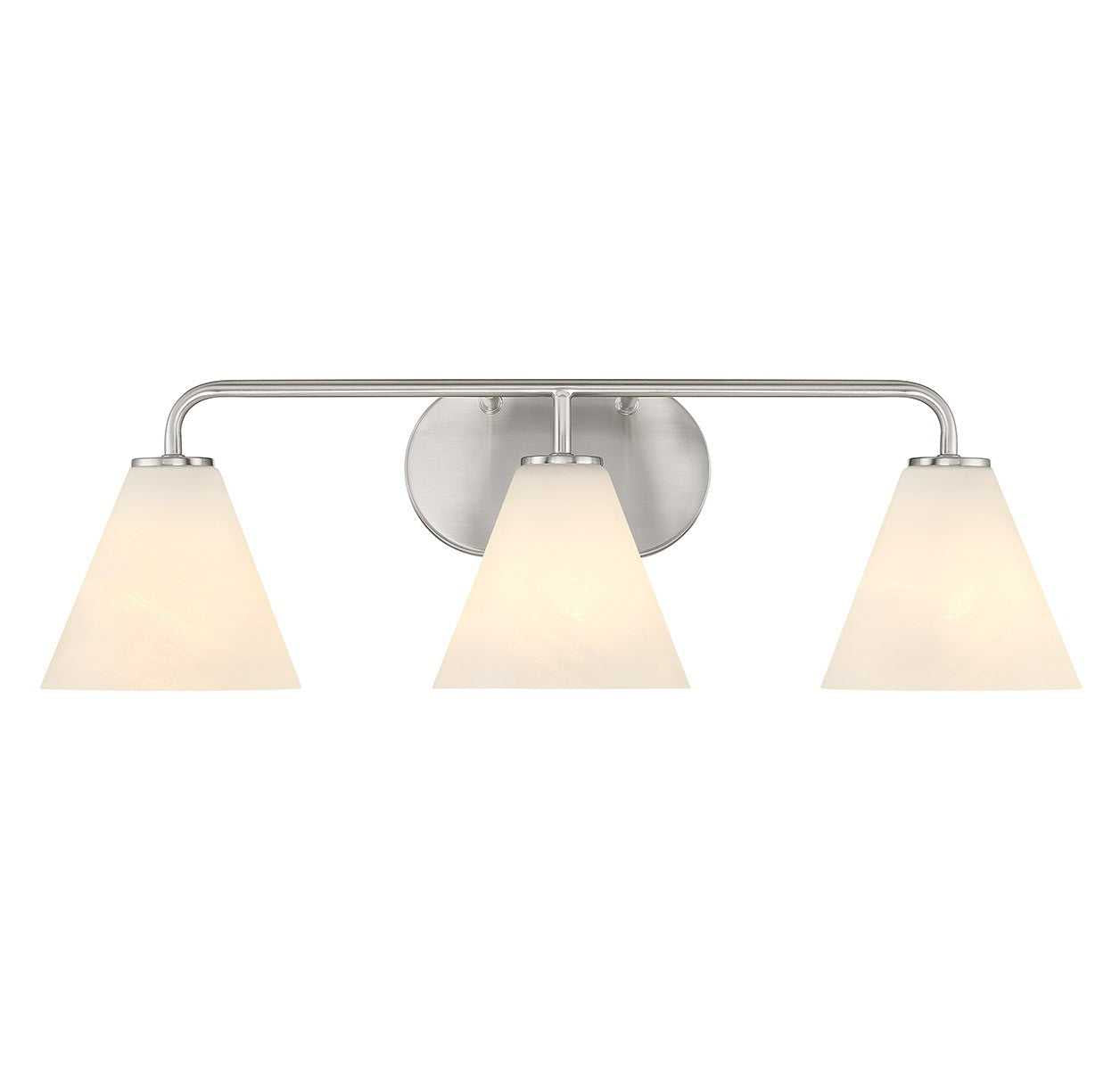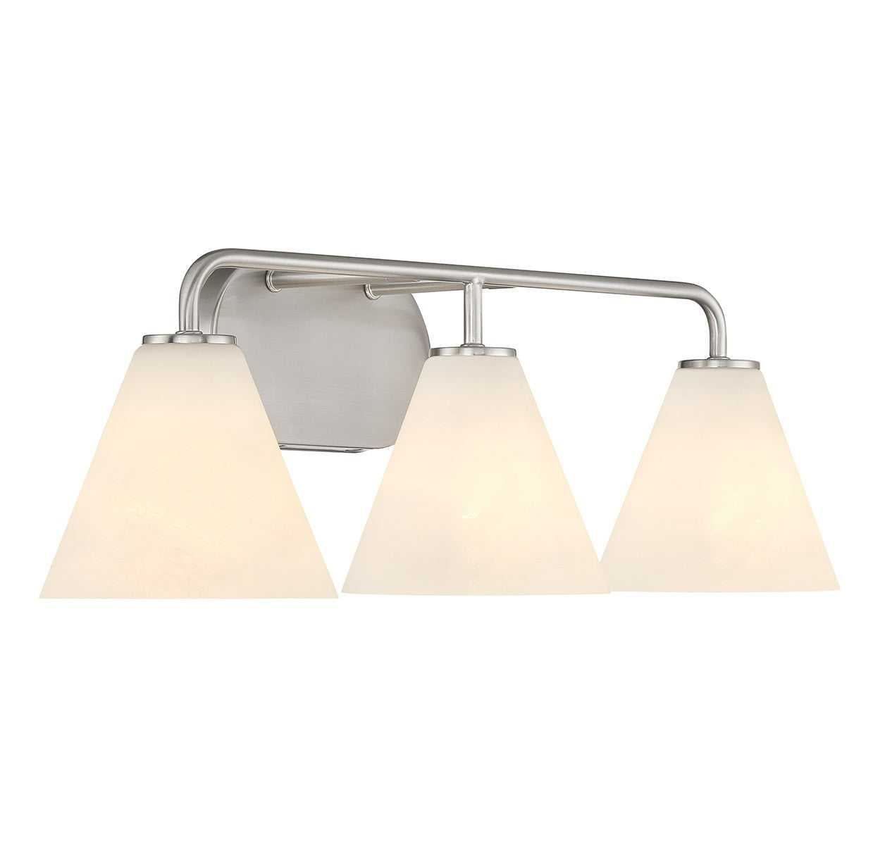 Get a warm and welcoming glow at the vanity with the Savoy House Blair 3-light bath light. Conical shades of white strie glass feature eye-catching wisps and swirls that add a touch of dimension and intrigue. The glass contrasts nicely with the versatile Satin Nickel finish. Blair is 8" in height, 25.5" in width and extends 8.5" from the wall. Uses three standard size bulbs of up to 60 watts per bulb. Bulbs not included. This bath light is damp area rated and may be installed with the glass facing up or down.