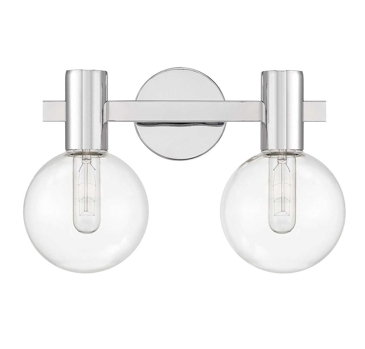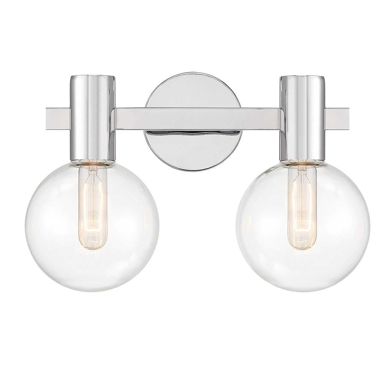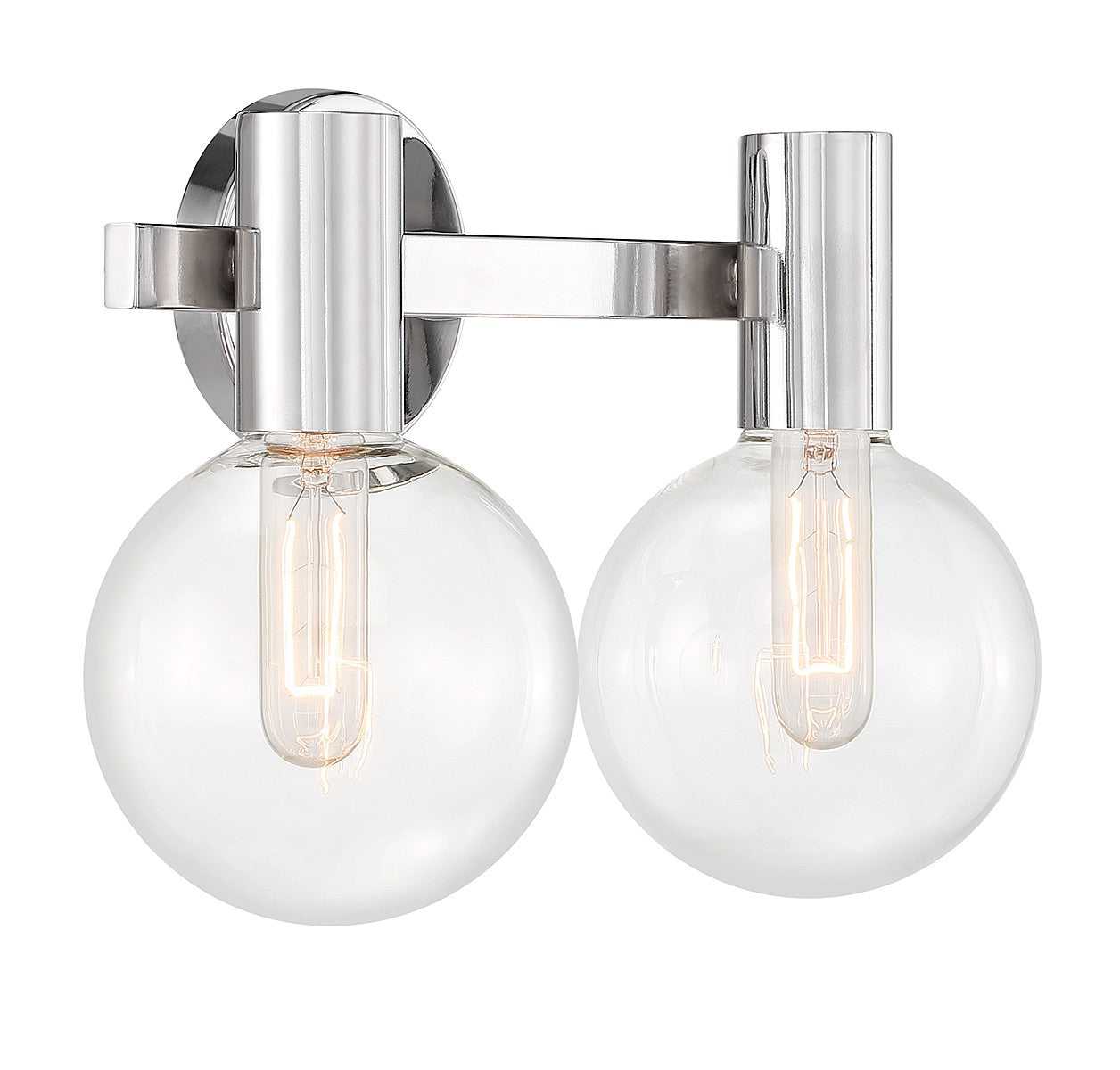 This Savoy House Wright 2-light bath vanity light showcases streamlined style that makes it ideal for any bathroom. Round clear glass shades add an extra dimension and extra protection for the light bulbs within. Chrome finish. Wright is 15.5" in width, 10" in height and extends 7.5" from the wall. Uses 2 standard size bulbs of up to 60 watts per bulb (bulbs not included). We recommend using tubular shaped bulbs.