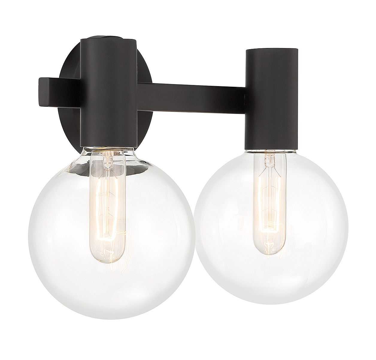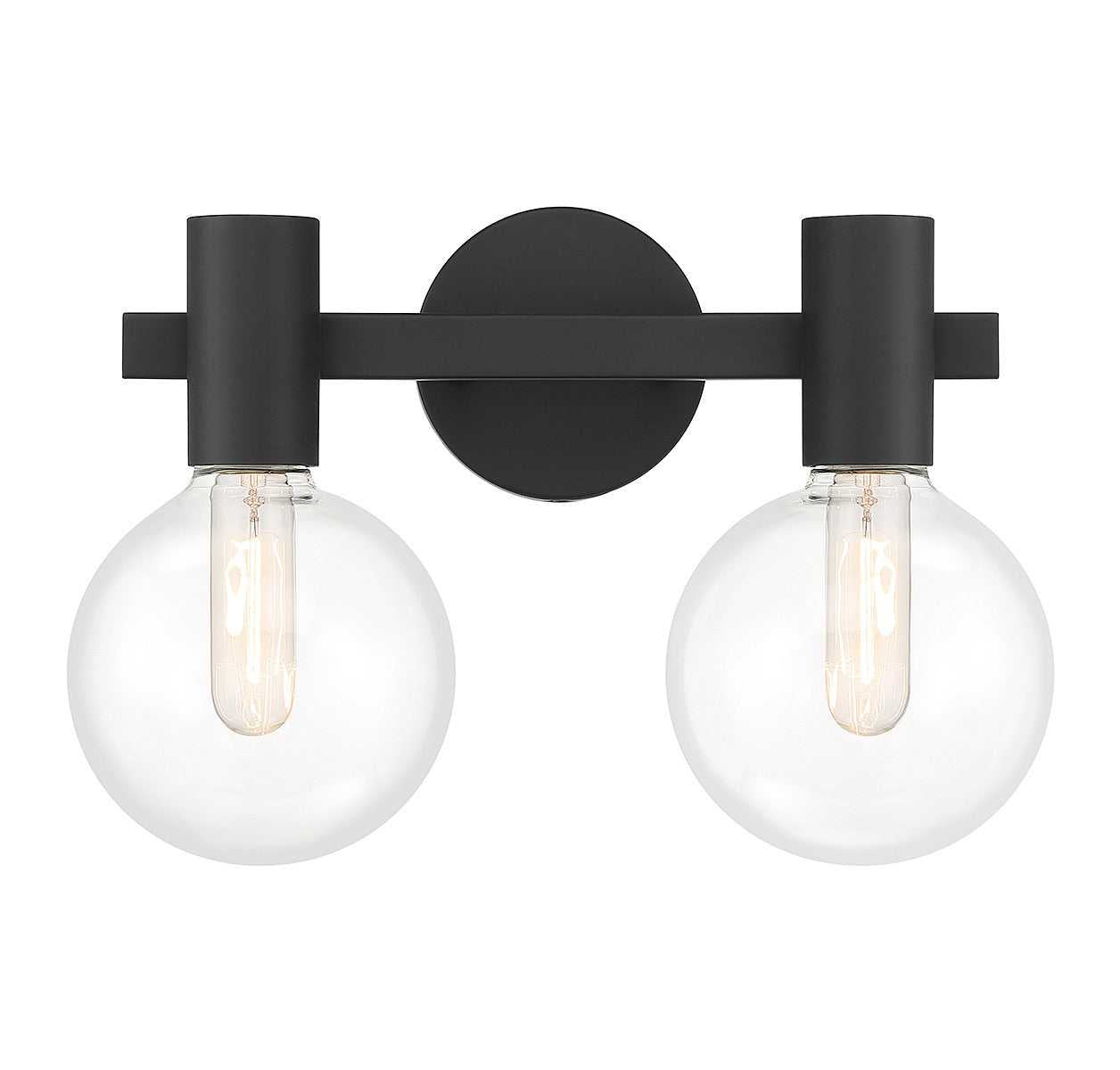 This Savoy House Wright 2-light bath vanity light showcases streamlined style that makes it ideal for any bathroom. Round clear glass shades add an extra dimension and extra protection for the light bulbs within. Matte black finish. Wright is 15.5" in width, 10" in height and extends 7.5" from the wall. Uses 2 standard size bulbs of up to 60 watts per bulb (bulbs not included). We recommend using tubular shaped bulbs.