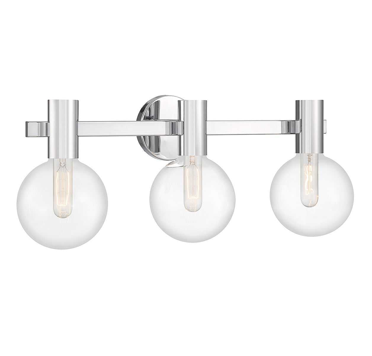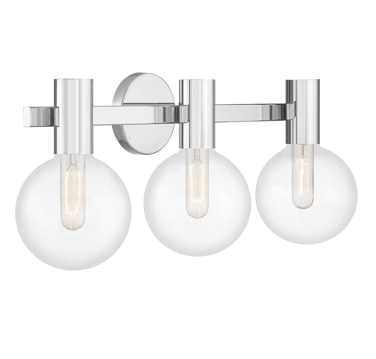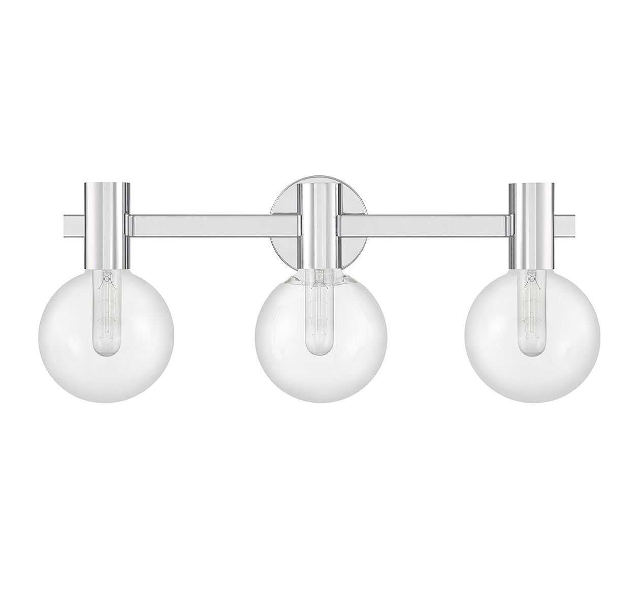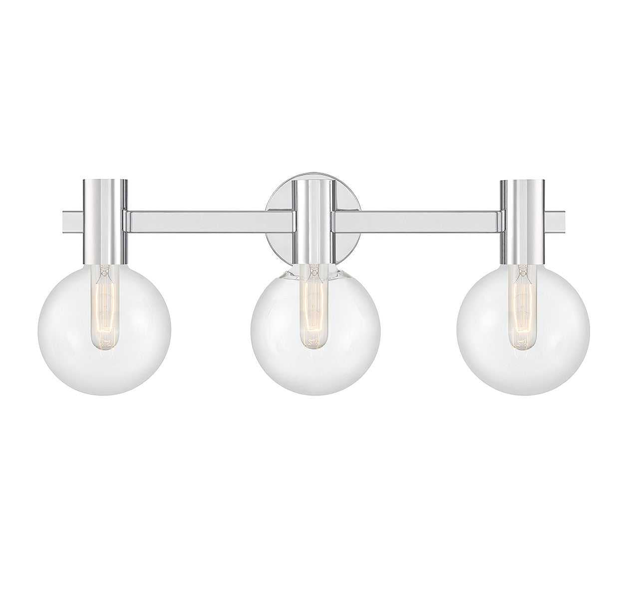 This Savoy House Wright 3-light bath vanity light showcases streamlined style that makes it ideal for any bathroom. Round clear glass shades add an extra dimension and extra protection for the light bulbs within. Chrome finish. Wright is 25" in width, 10" in height and extends 7.5" from the wall. Uses 3 standard size bulbs of up to 60 watts per bulb (bulbs not included). We recommend using tubular shaped bulbs.