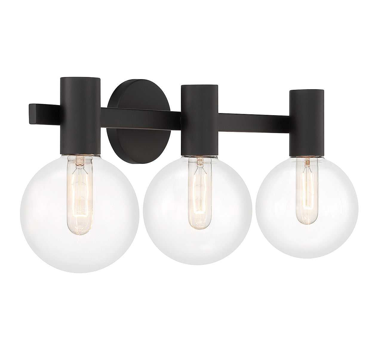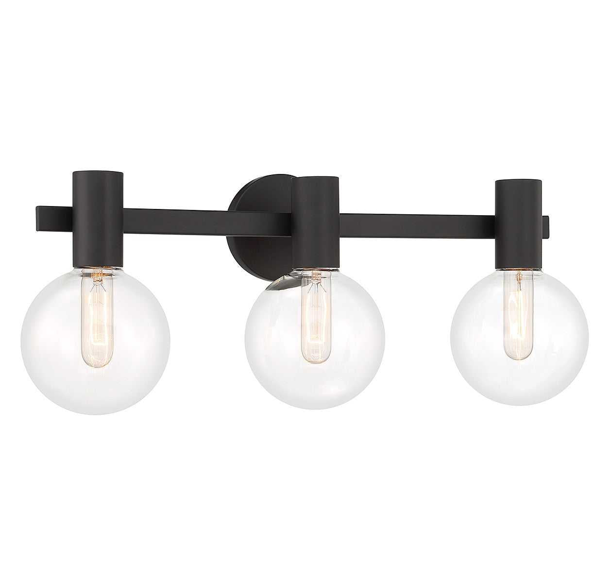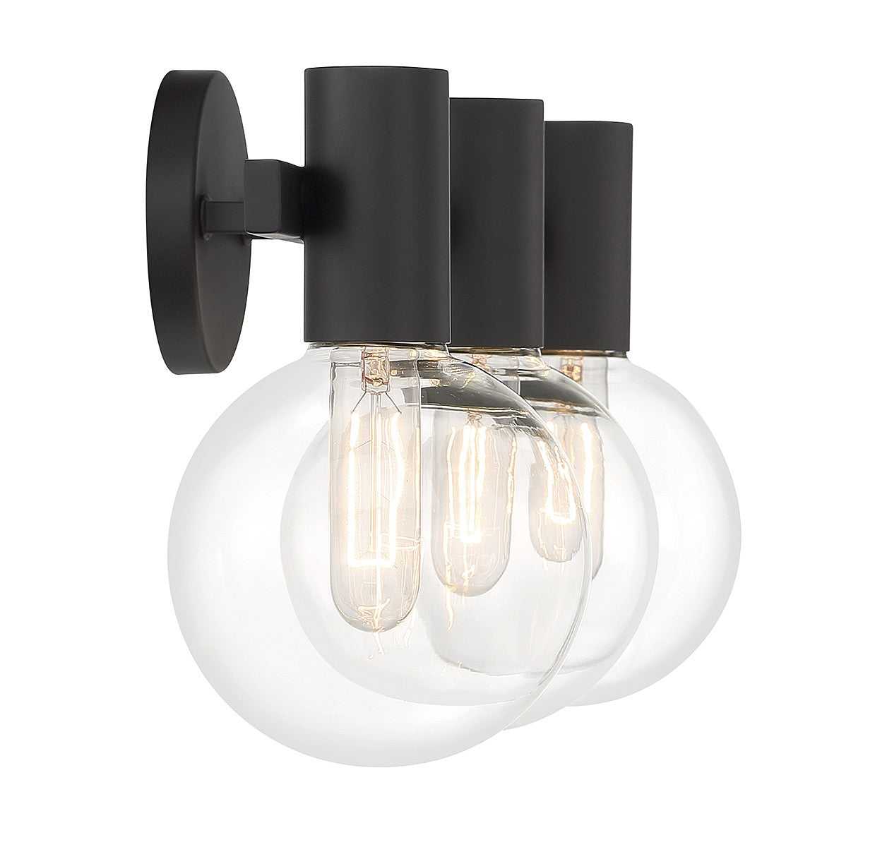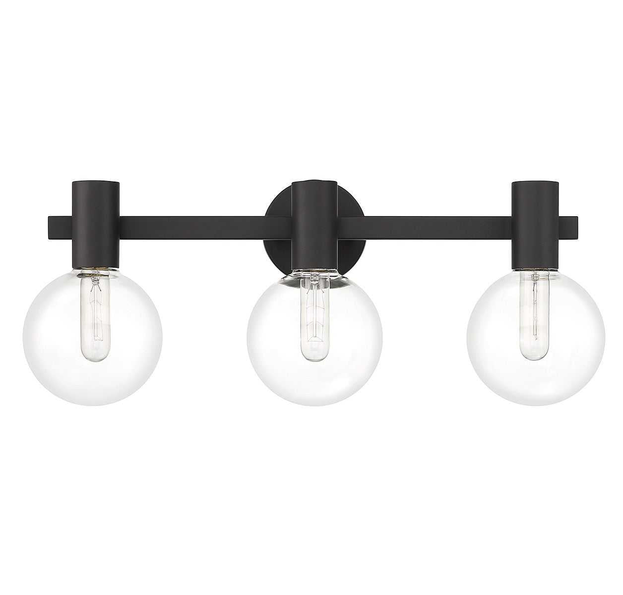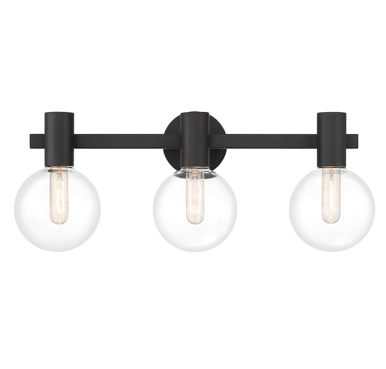 This Savoy House Wright 3-light bath vanity light showcases streamlined style that makes it ideal for any bathroom. Round clear glass shades add an extra dimension and extra protection for the light bulbs within. Matte black finish. Wright is 25" in width, 10" in height and extends 7.5" from the wall. Uses 3 standard size bulbs of up to 60 watts per bulb (bulbs not included). We recommend using tubular shaped bulbs.