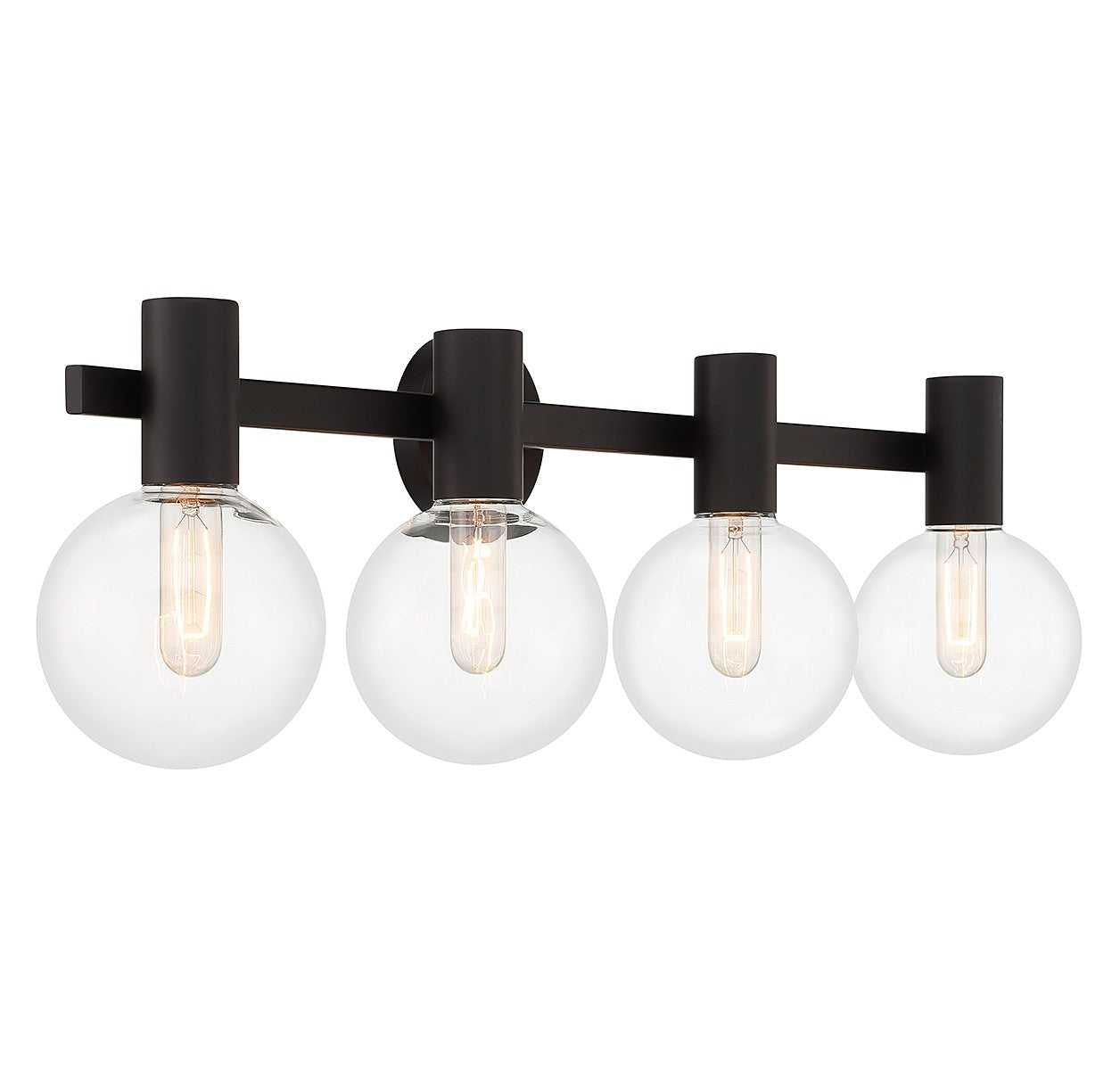 This Savoy House Wright 4-light bath vanity light showcases streamlined style that makes it ideal for any bathroom. Round clear glass shades add an extra dimension and extra protection for the light bulbs within. Matte black finish. Wright is 34" in width, 10" in height and extends 7.5" from the wall. Uses 4 standard size bulbs of up to 60 watts per bulb (bulbs not included). We recommend using tubular shaped bulbs.