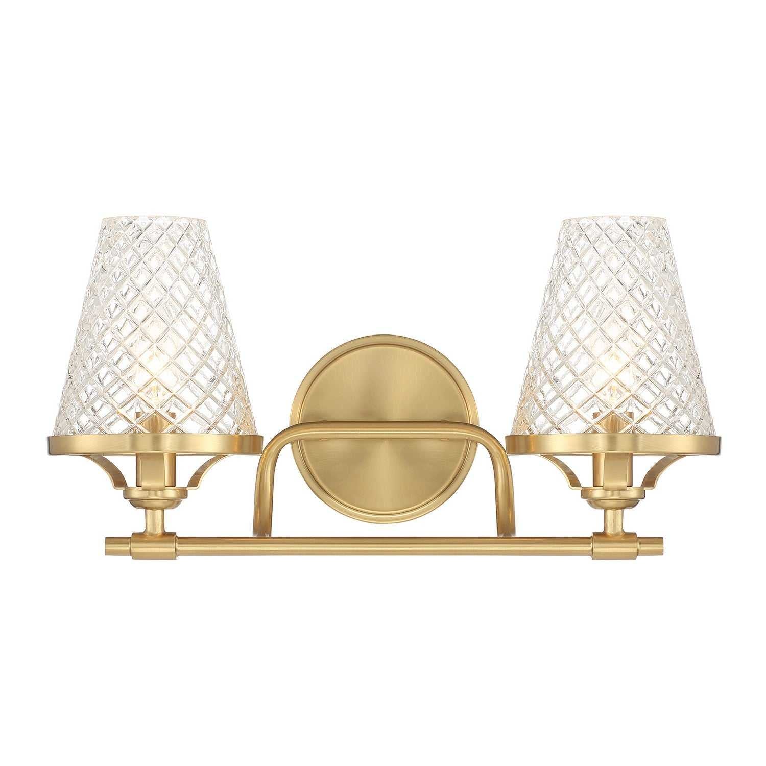 Infuse a bathroom with the vintage-inspired charm of the Candler 2-light bath bar from Savoy House. Two shades of tapered clear glass showcase a diamond pattern that adds texture, heightens the drama and recalls beautiful antique glassware. Warm Brass finish. Candler is 8.75" in height, 16.5" in width and extends 7.5" from the wall. Uses two candelabra size bulbs of up to 60 watts per bulb. Bulbs not included. This bath light is damp area rated and must be installed as shown.