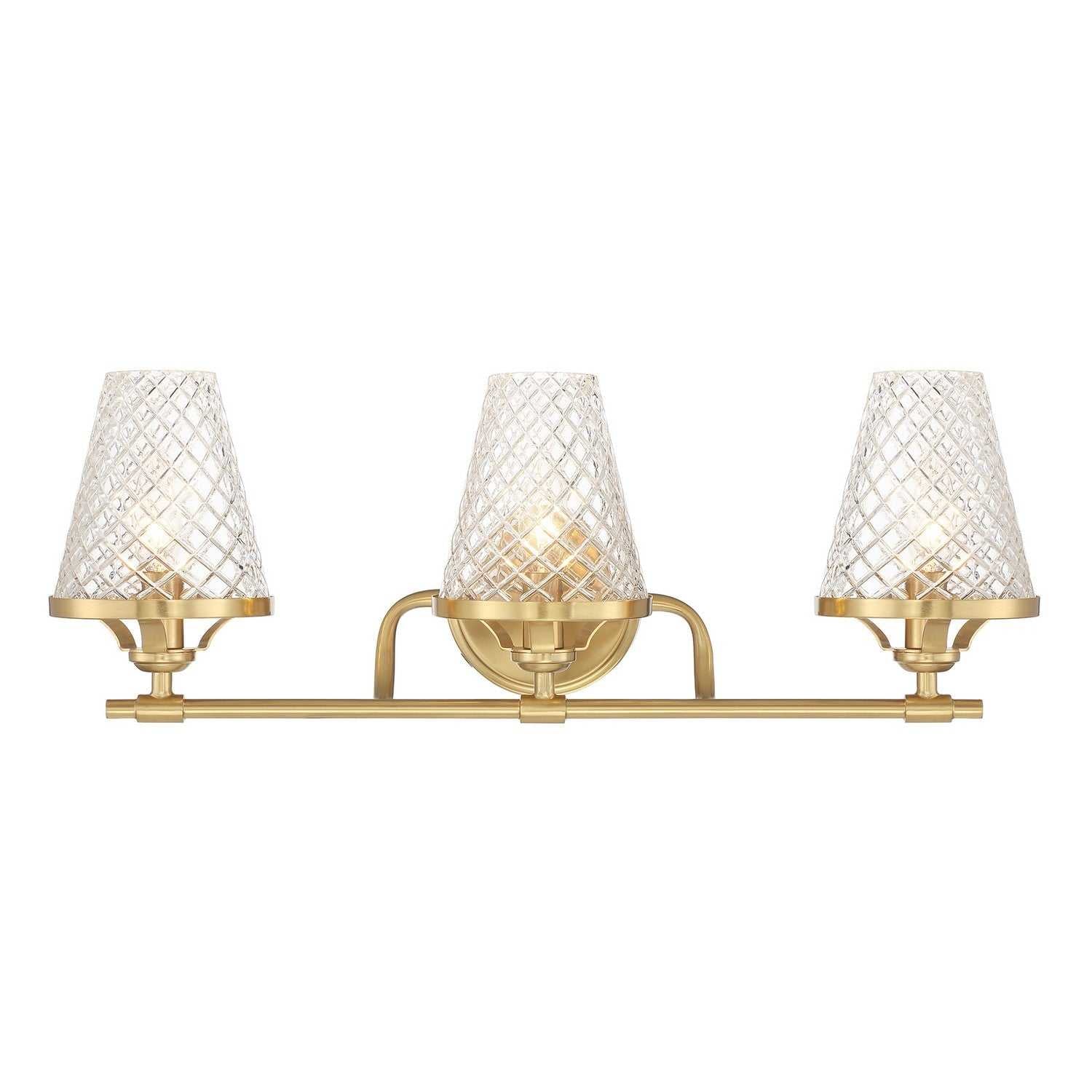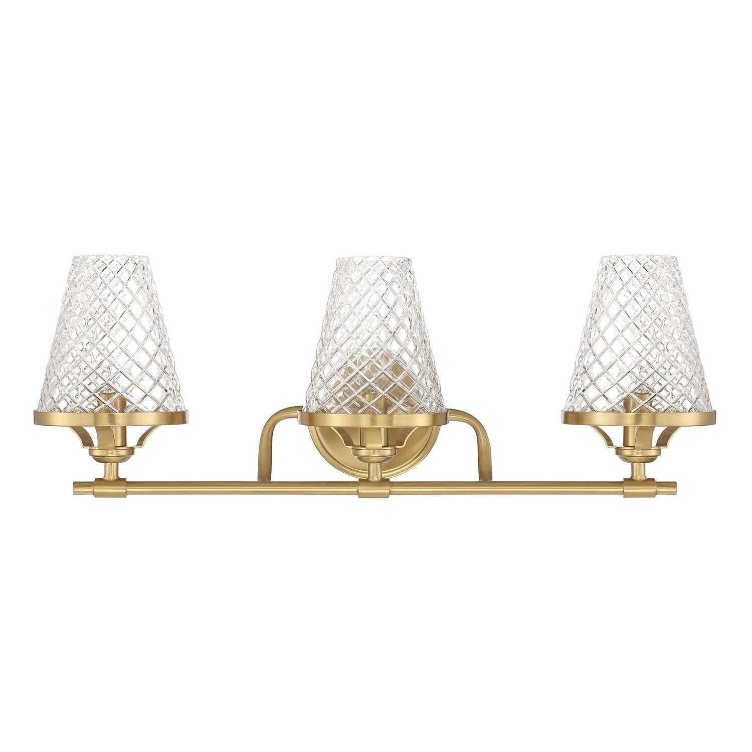 Infuse a bathroom with the vintage-inspired charm of the Candler 3-light bath bar from Savoy House. Three shades of tapered clear glass showcase a diamond pattern that adds texture, heightens the drama and recalls beautiful antique glassware. Warm Brass finish. Candler is 8.75" in height, 24" in width and extends 7.5" from the wall. Uses three candelabra size bulbs of up to 60 watts per bulb. Bulbs not included. This bath light is damp area rated and must be installed as shown.