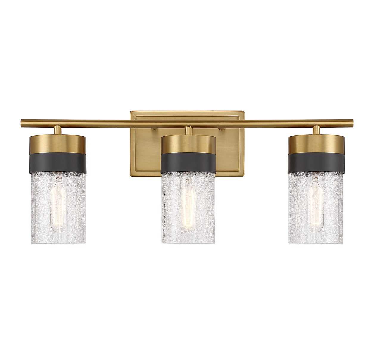 From top to bottom, the Savoy House Brickell 3-light bath vanity light is designed to make any bathroom a standout space. Its classic pairing of warm brass and black is made even better with the addition of textural clear crackled glass shades. Brickell is 8.75" in height, 22" in width and extends 5" from the wall. It uses 3 standard size bulbs of up to 60 watts per bulb (bulbs not included).