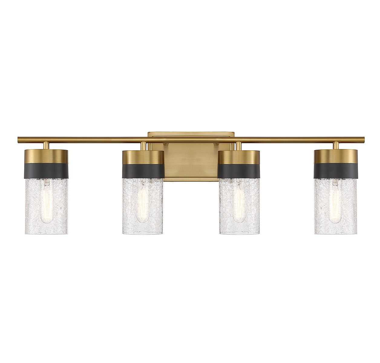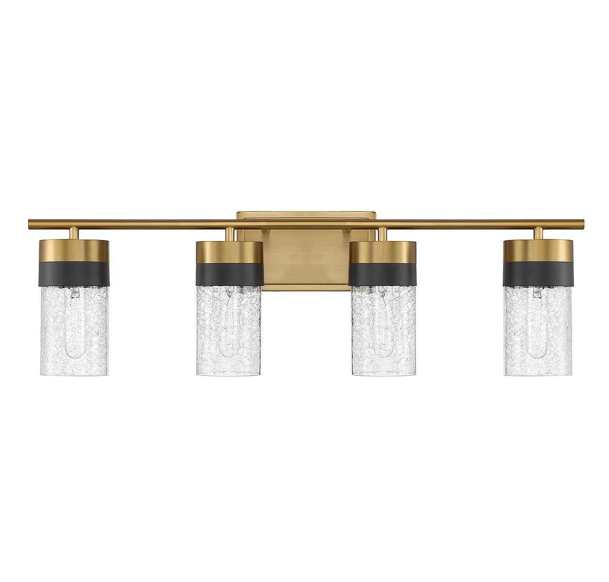 From top to bottom, the Savoy House Brickell 4-light bath vanity light is designed to make any bathroom a standout space. Its classic pairing of warm brass and black is made even better with the addition of textural clear crackled glass shades. Brickell is 8.75" in height, 30" in width and extends 5" from the wall. It uses 4 standard size bulbs of up to 60 watts per bulb (bulbs not included).