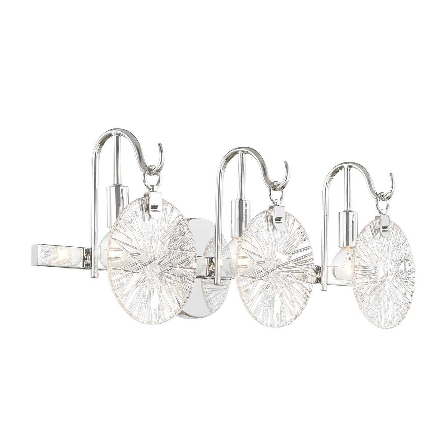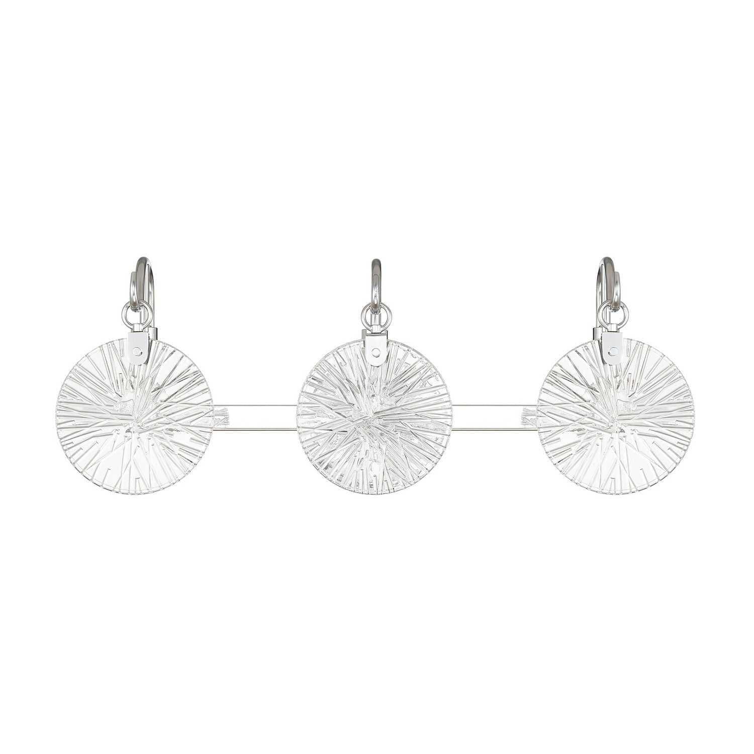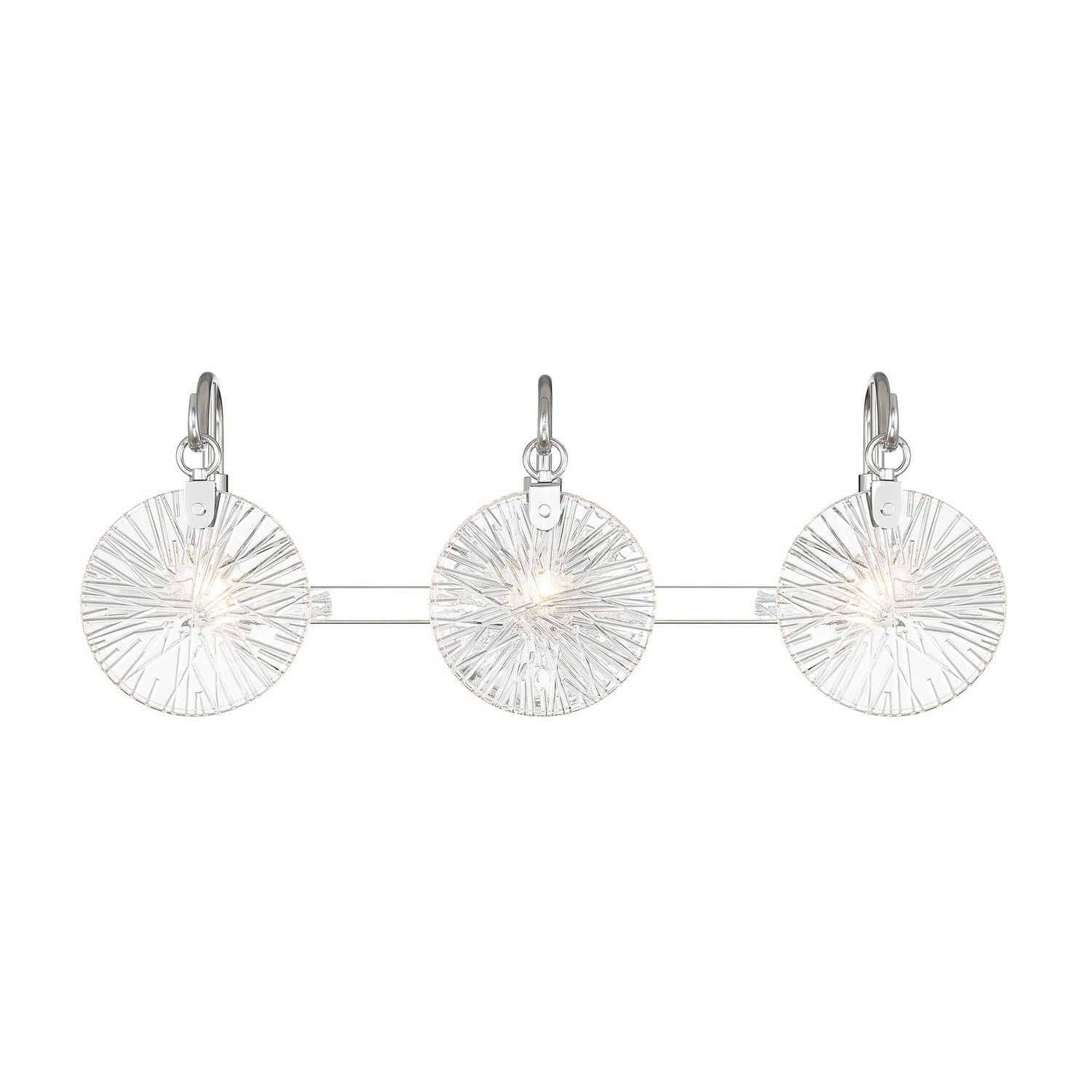 It is often said that lighting is the jewelry of the home. With its fun hook-style arms that hold flat, round, starburst clear glass shades, the Savoy House Addison 3-light bath light is a great example of this saying. The backplate is finished in Chrome and mimics the shape of the glass shades. Addison is 9" in height, 24" in width and extends 6.5" from the wall. Uses three candelabra size bulbs of up to 60 watts per bulb. Bulbs not included. This bath bar is damp area rated and must be installed as shown.