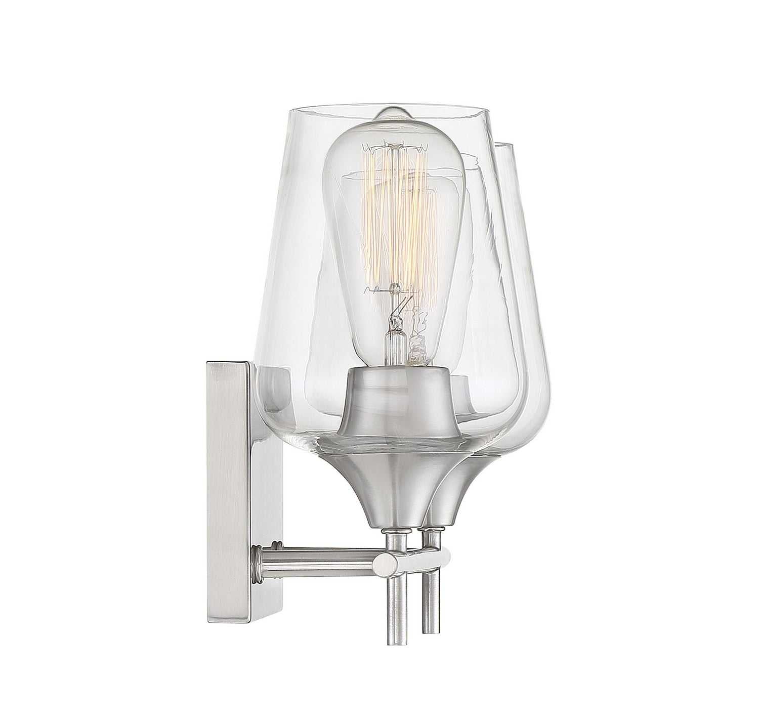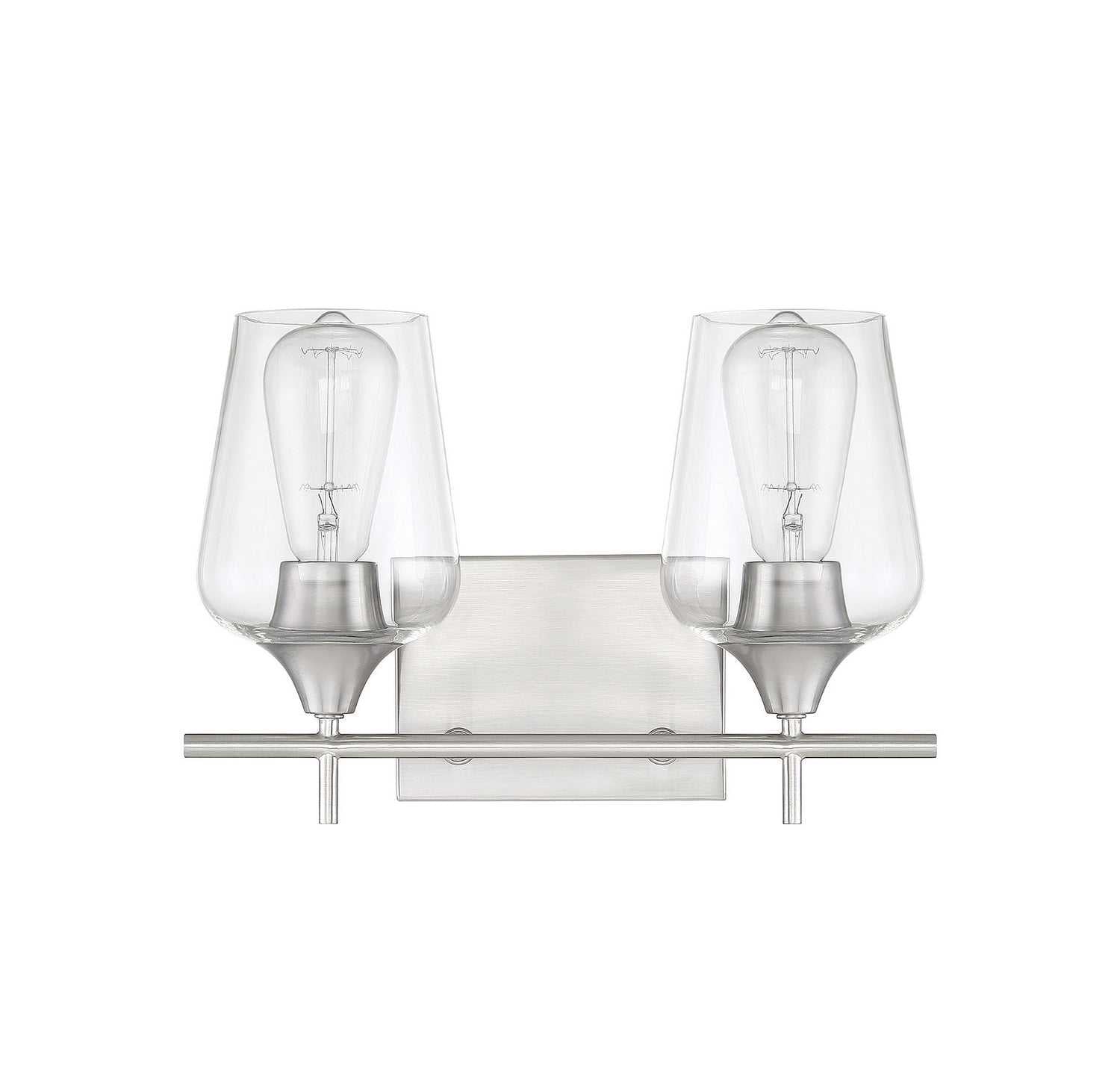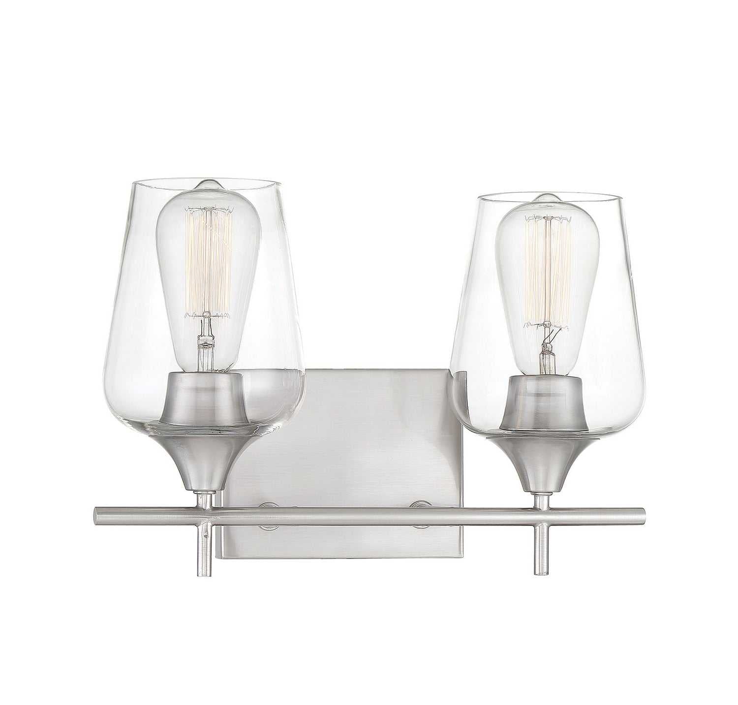 In the Savoy House Octave 2-light bath bar, bold light-colored lines and a streamlined silhouette create an air of elegance and sophistication. The satin nickel finish and clear glass shades go with absolutely everything. Whether you have transitional, contemporary, bohemian or other decor styles in your bath, you'll love the way this Octave fixture stylishly blends in. The bath bar is 13.75" wide, 9.5" high and extends 5.5" from the wall. The curved glass shades have a graceful, uncluttered look and two 60W standard size bulbs provide lovely light above the vanity. Plus, it may be mounted as either uplight or downlight, creating a sleek and clean choice for your bathroom or powder room.