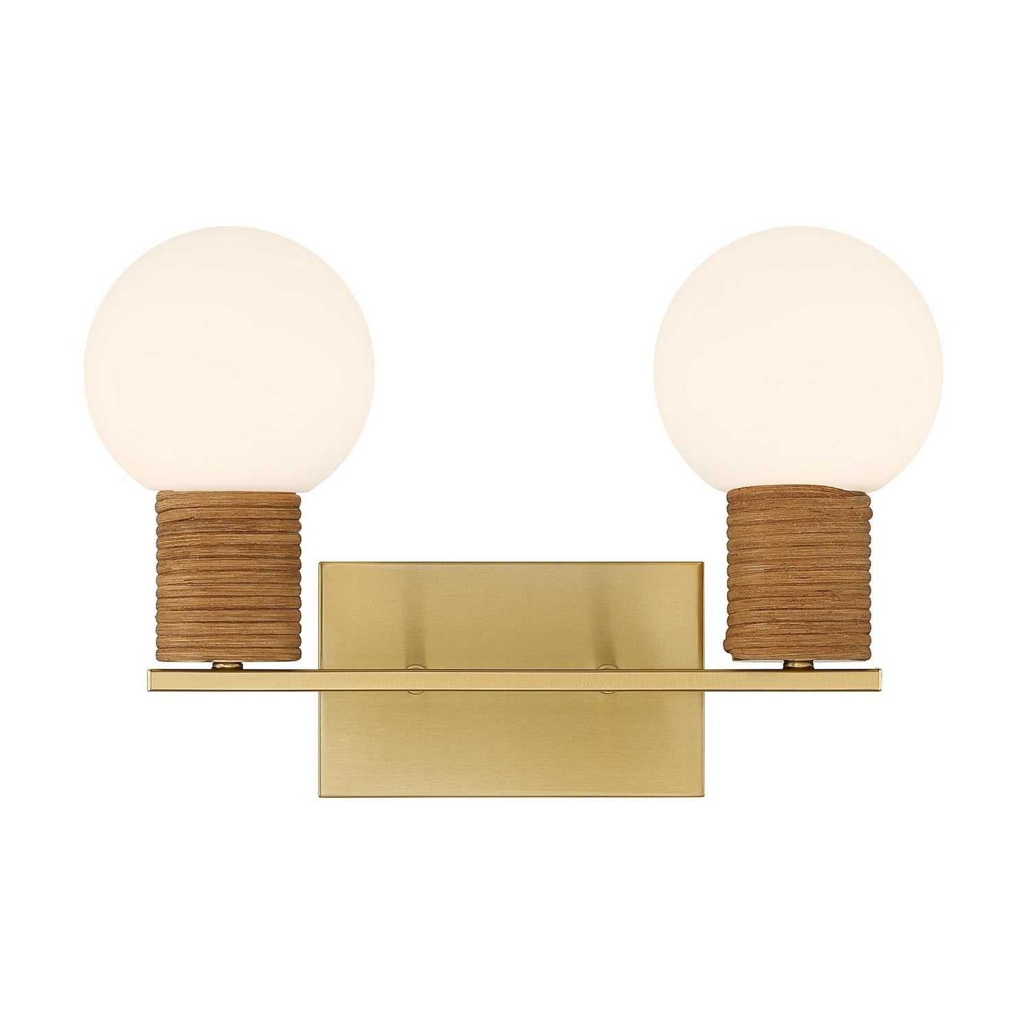 Warm Brass pairs beautifully with natural rattan accents in the Savoy House Jarrell 2-light vanity light, offering a breezy yet polished look for any bath. Jarrell is 10" tall, 14.63" wide and extends 6.5" from the wall. It uses two candelabra size bulbs of up to 60 watts each (bulbs not included).