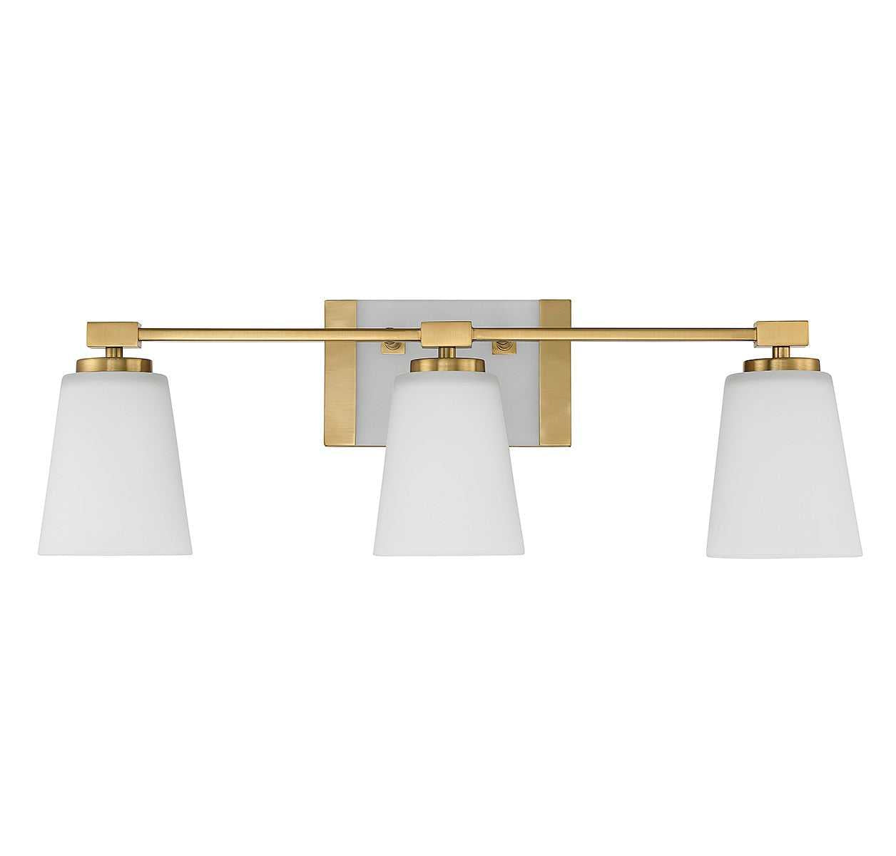 Add a relaxing spa feeling to any bathroom with the Savoy House Darby 3-light bath vanity light! White glass shades offer up a soft yet flattering glow while a matching pane of white glass creates a serene floating effect. Finished in warm brass. Darby is 8" in height, 25.25" in width and extends 7" from the wall. Uses three standard size bulbs of up to 60 watts per bulb (bulbs not included).