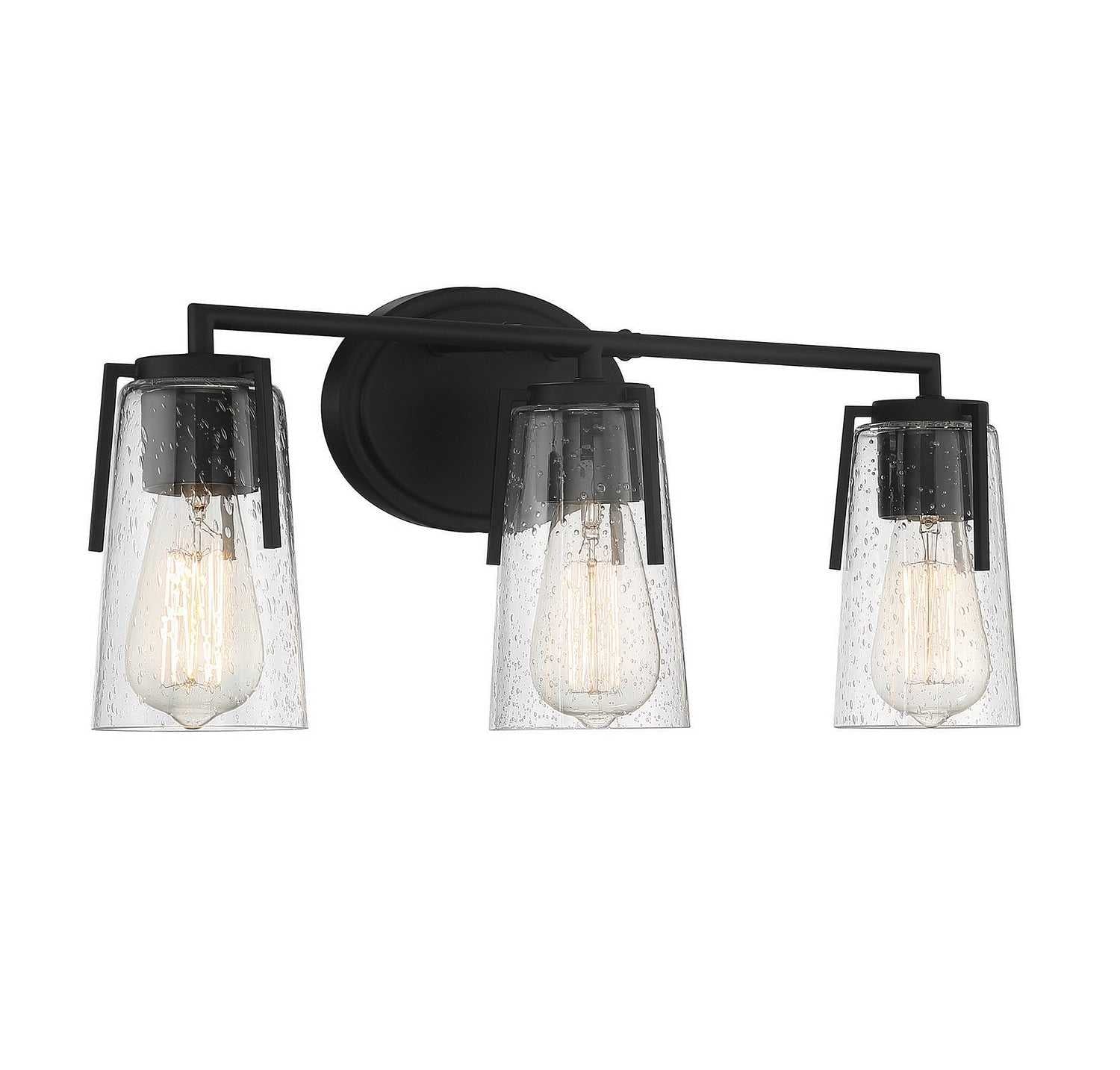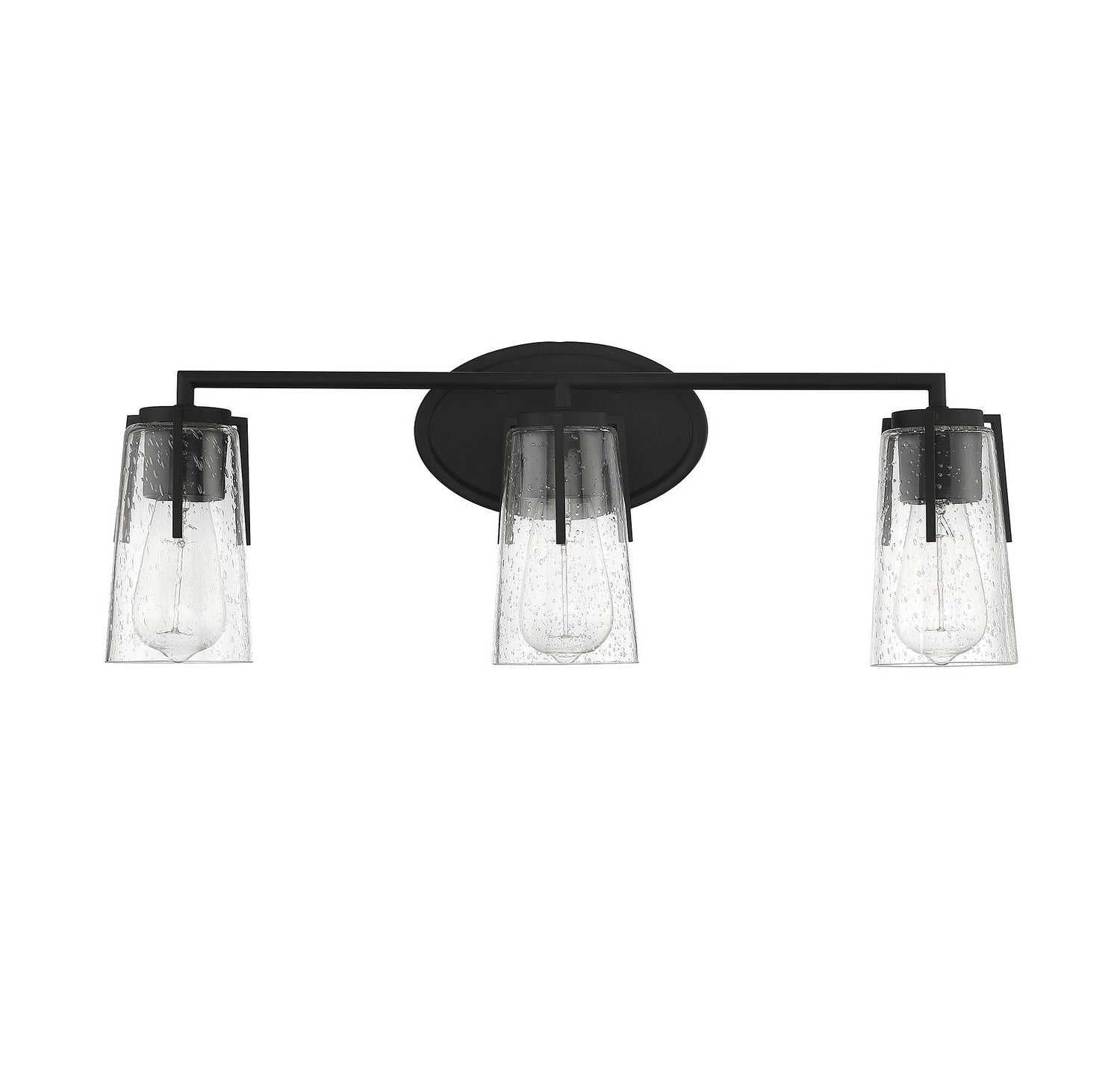 A clean, streamlined design with clear seeded glass shades defines the Sacremento collection. Measuring 24" wide.5" high and extending 5.38" from the wall, this three-light bath bar in a black finish provides ample illumination from three 60-watt standard size bulbs.