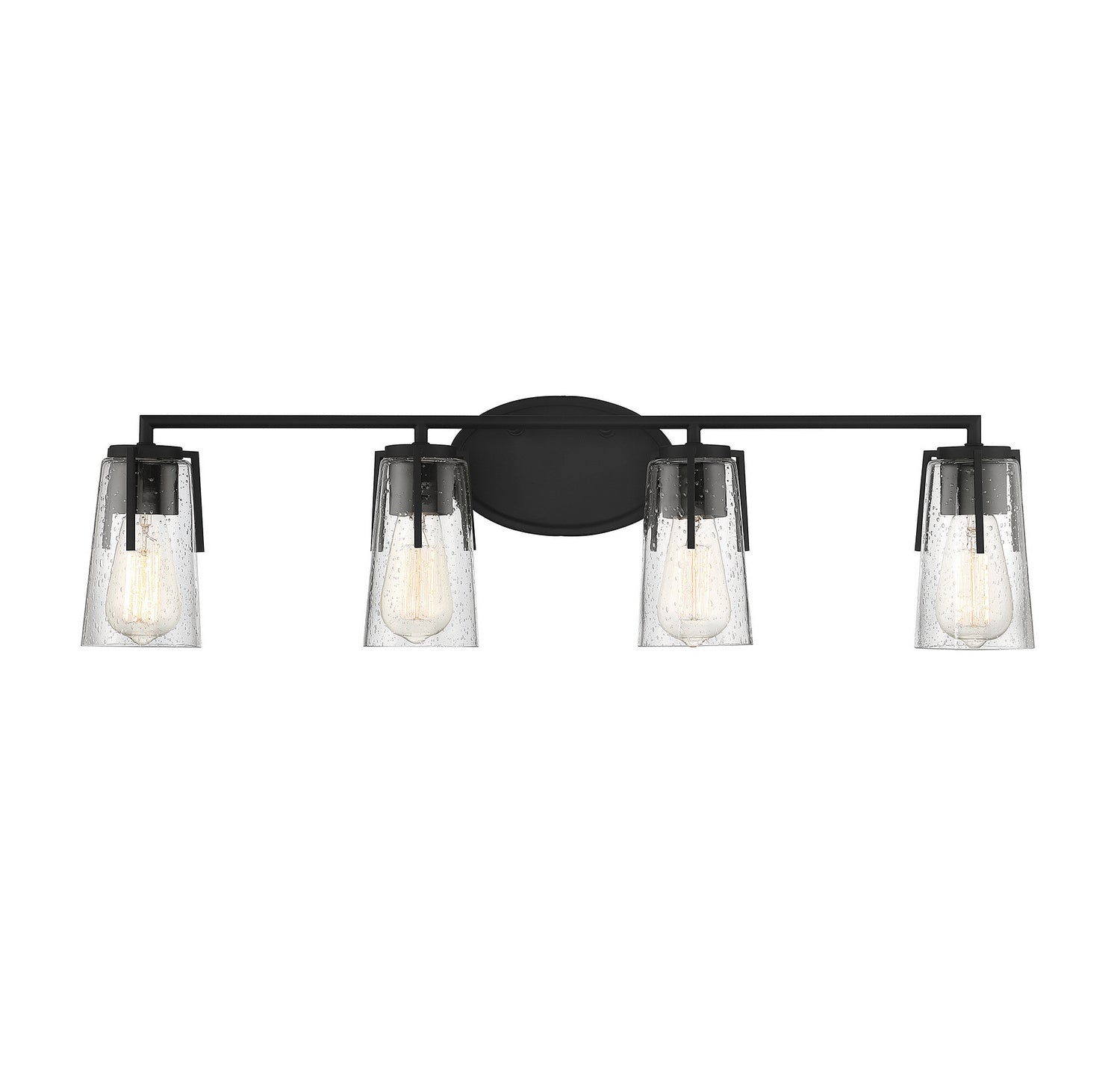 A clean, streamlined design with clear seeded glass shades defines the Sacremento collection. Measuring 32" wide.5" high and extending 5.38" from the wall, this four-light bath bar in a black finish provides ample illumination from four 60-watt standard size bulbs.