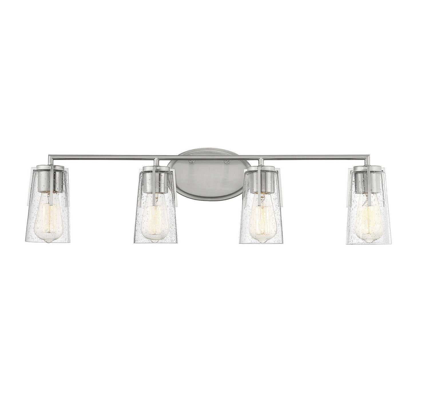 A clean, streamlined design with clear seeded glass shades defines the Sacremento collection. Measuring 32" wide.5" high and extending 5.38" from the wall, this four-light bath bar in a satin nickel finish provides ample illumination from four 60-watt standard size bulbs.