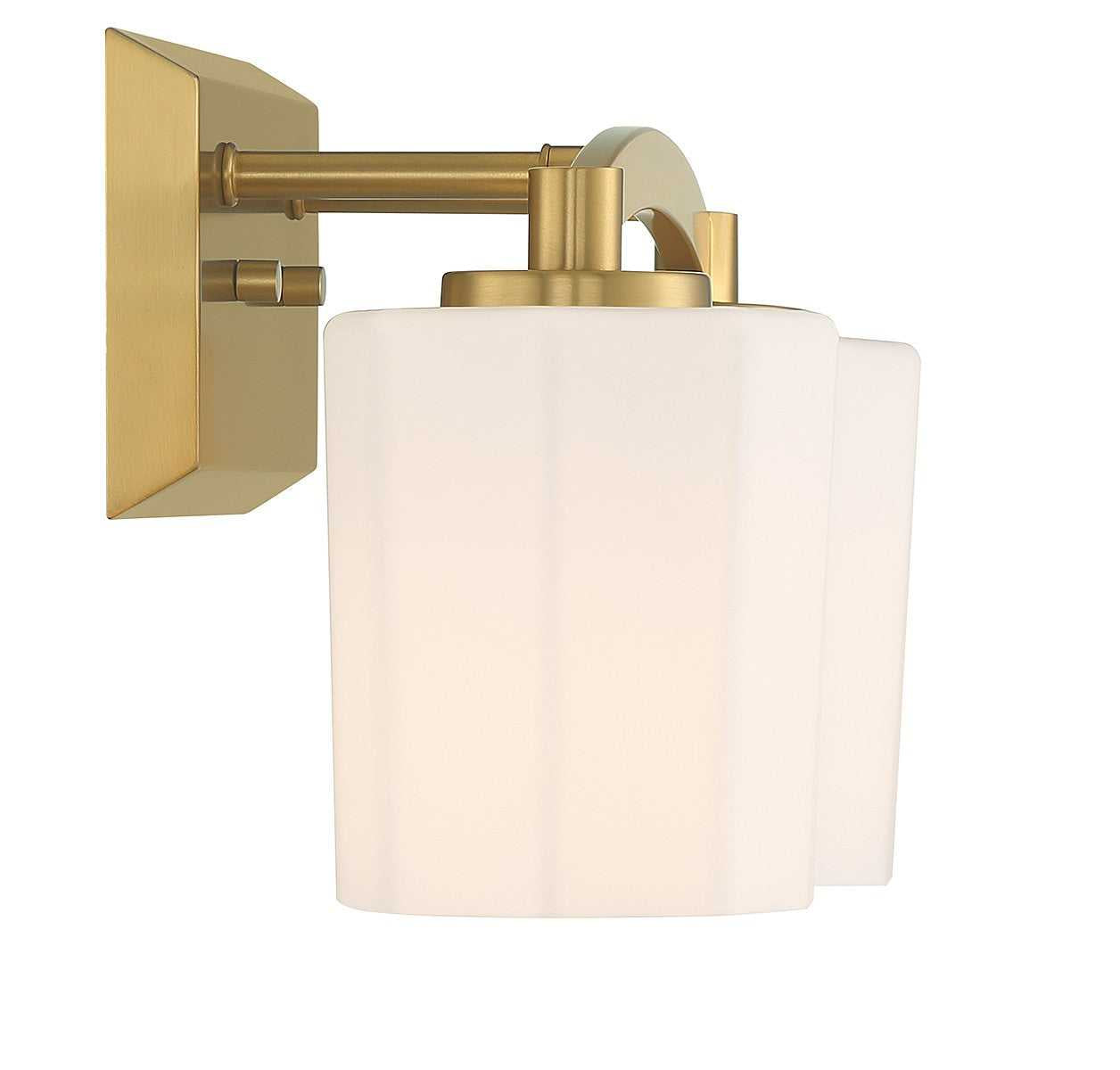 Get understated glamour for the bathroom with this Savoy House Whitney 2-light bath vanity light. Fluted shades of opal etched glass offer up a flattering glow, the curving arm adds intrigue and the warm brass finish adds versatility. Whitney is 8" in height, 14" in width and extends 6.5" from the wall. It uses two standard size bulbs of up to 60 watts per bulb (bulbs not included).