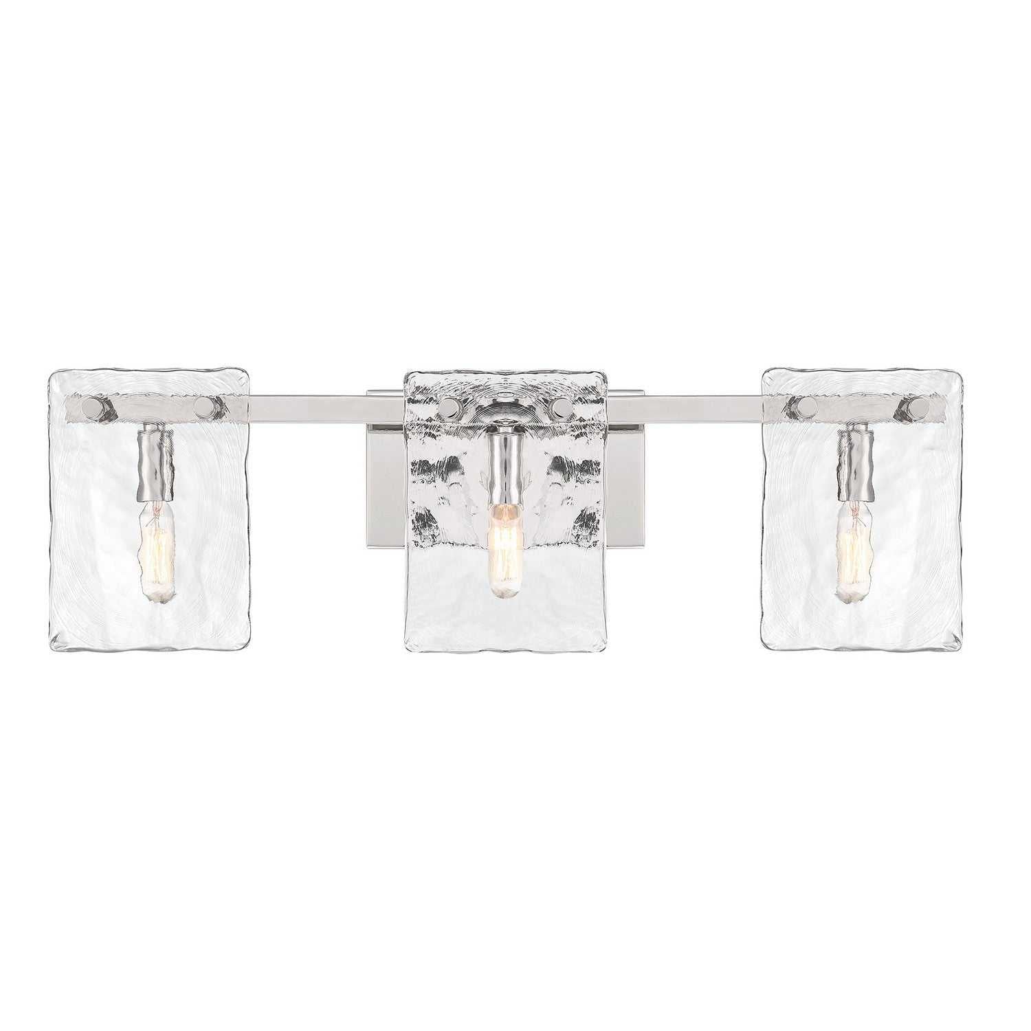 Bring a beautiful ocean-inspired lighting look to your home with the Savoy House Genry 3-light bath bar. It is decorated with rippling panes of handmade glass and finished in Polished Nickel. Genry is 7.75" in height, 25" in width and extends 5.5" from the wall. It uses three candelabra size bulbs of up to 60 watts per bulb. Bulbs not included. This bath light is damp area rated and must be installed as shown.