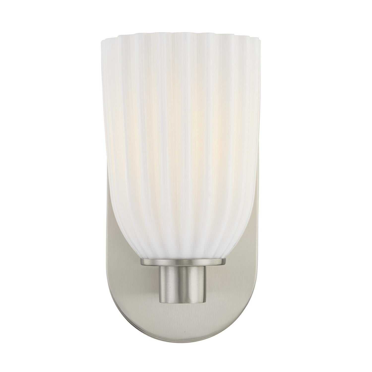 The Savoy House Baldwin 1-light sconce blends simplicity with sophistication. A Satin Nickel finish brings crisp appeal while the ribbed opal glass shade adds subtle texture and soft illumination. Baldwin is 8.75" in height, 4.5" in width and extends 6.25" from the wall. It uses one standard size bulb of up to 60 watts. Bulb not included. Damp area rated.