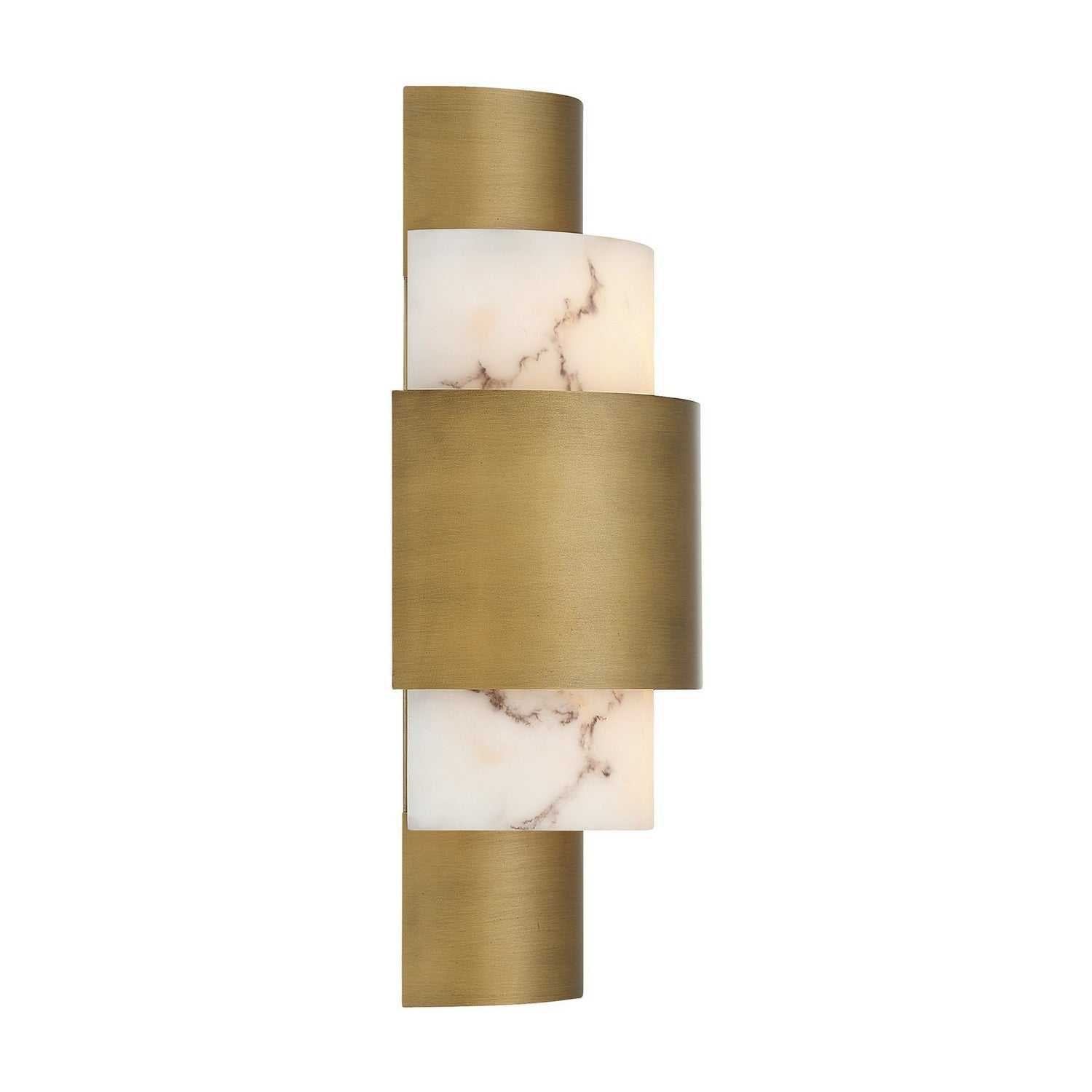 Easily brighten any space and add a touch of Art Deco-inspired charm with the Savoy House Davenport 2-light wall sconce. Bands finished in Antique Patina frame panels of realistic faux alabaster with exquisite veining, creating a striking interplay of depth and texture. Davenport is 16" in height, 10" in width and extends 5" from the wall. Uses two candelabra size bulbs of up to 60 watts per bulb. Bulbs not included.
