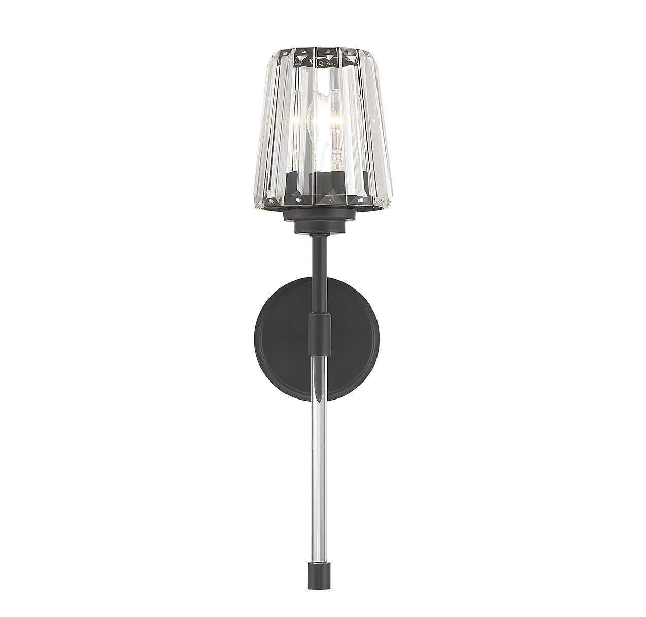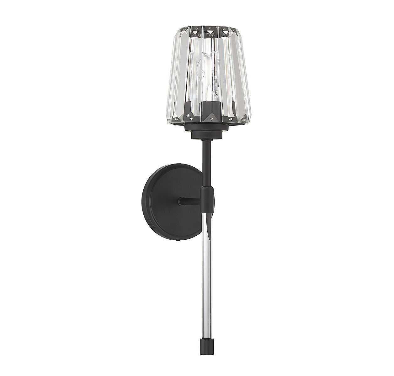 Take the glam factor of any room up a notch with the Savoy House Garnet 1-light sconce! Slats of faceted clear crystal add shimmer while the crystal tube detailing on the arm brings even more shine. Finished in matte black. Garnet is 20.5" in height, 5.5" in width and extends 7" from the wall. Uses 1 standard size bulb of up to 60 watts (bulb not included).
