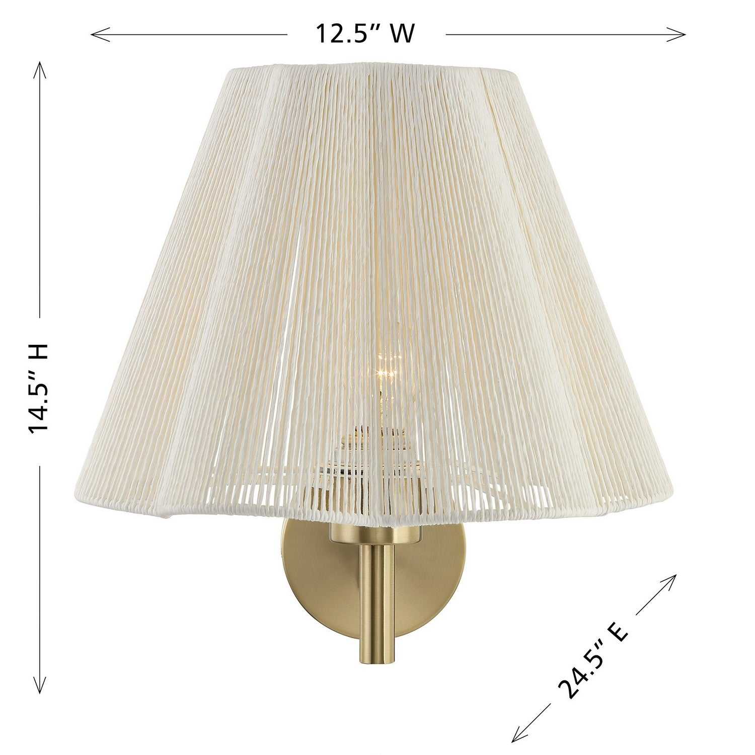 The Savoy House Rosa 1-light sconce was designed by award-winning interior designer and TV host Breegan Jane. Named after the Spanish word for rose, this sconce blooms beautifully with a scalloped white string shade that brings in lots of terrifically touchable texture and relaxed organic appeal. The Noble Brass finish adds shimmer and shine. An adjustable arm lets you bring the light exactly where you need it and, for even more convenience, this sconce can be plugged in or hardwired. Rosa is 14.5" in height, 12.5" in width and extends up to 24.5" from the wall. It uses one standard size bulb of up to 60 watts. Bulb not included. This sconce is damp area rated.