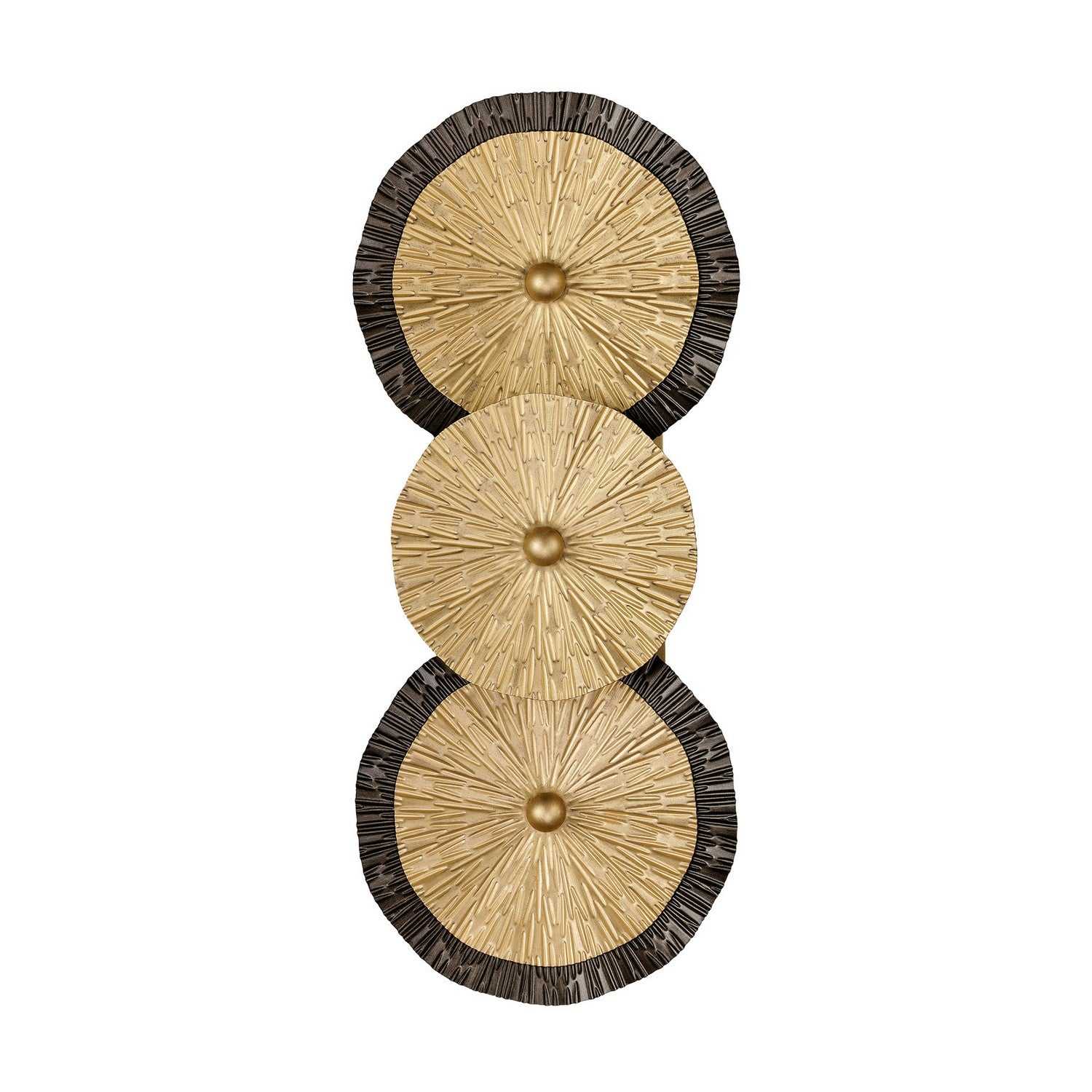 The Savoy House Lincoln 2-light sconce was designed by Breegan Jane, an award-winning interior designer and TV host. Breegan is from California and infuses her designs with the laid-back, organic touches that are characteristic of the Golden State. Lincoln holds spectacular eye-catching wheels finished by hand in Distressed Gold and Bronze, bringing a big dose of touchable texture and glamour. Lincoln is 17.25" in height, 7.25" in width and extends 6" from the wall. It uses two candelabra size bulbs of up to 60 watts per bulb. Bulbs not included. This sconce is damp area rated.
