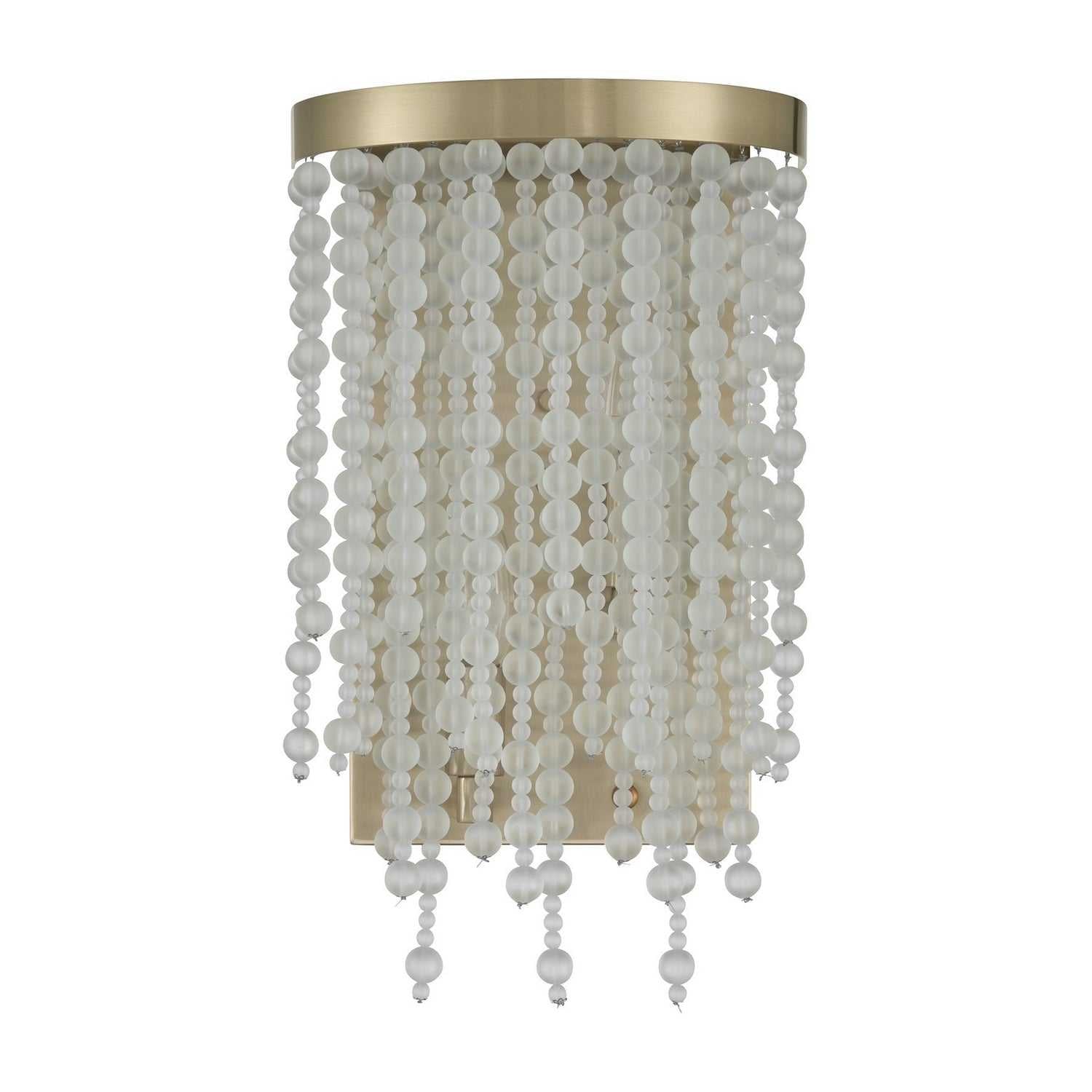 The Savoy House Jeanette 2-light sconce brings a touch of playful elegance to any wall. Its cluster of white frosted glass baubles strikes a beautiful balance between whimsy and refinement, offering a soft glow that feels inviting even before the light is on. The Noble Brass finish adds richness and warmth. Jeanette is 16" in height, 9" in width, and extends 5.25" from the wall. It uses two candelabra size bulbs of up to 60 watts per bulb. Bulbs not included. This sconce is damp area rated.