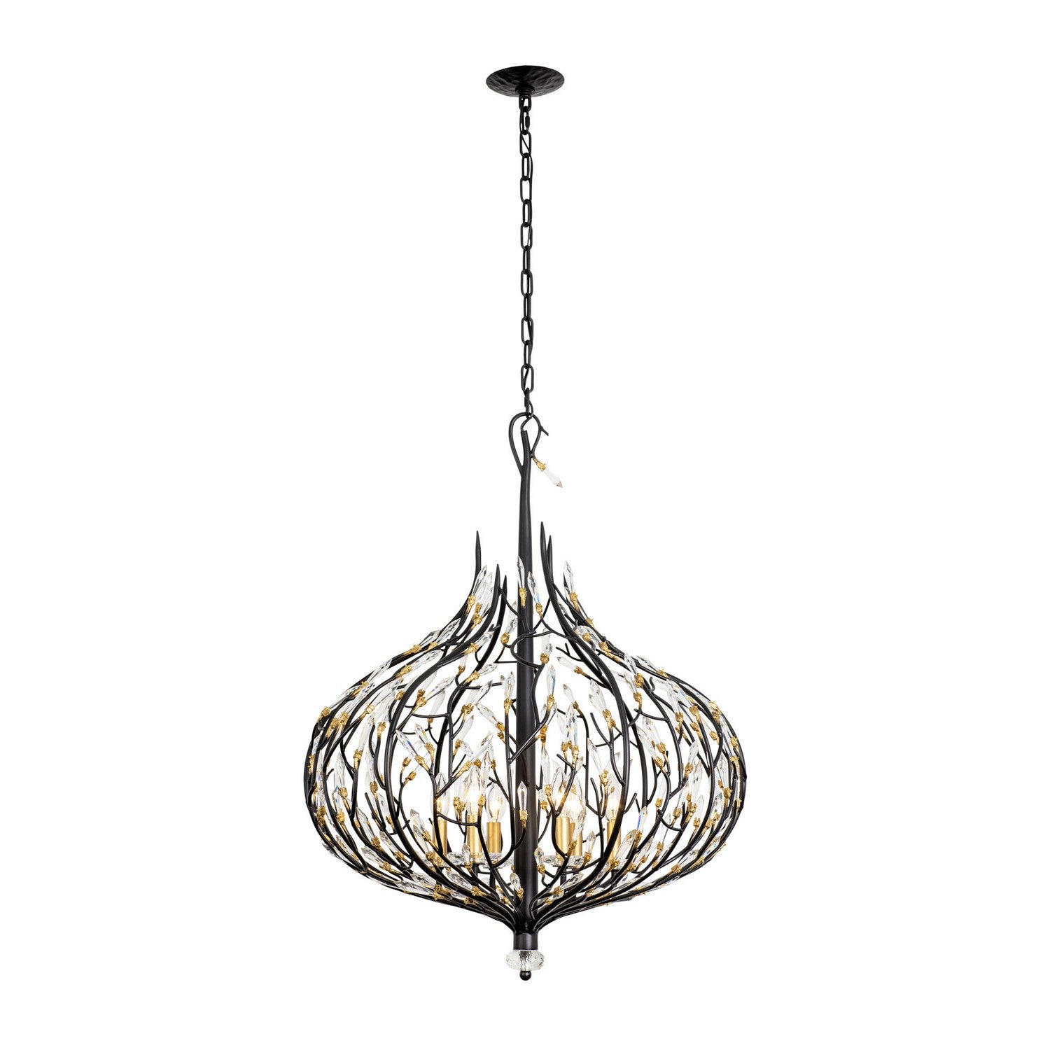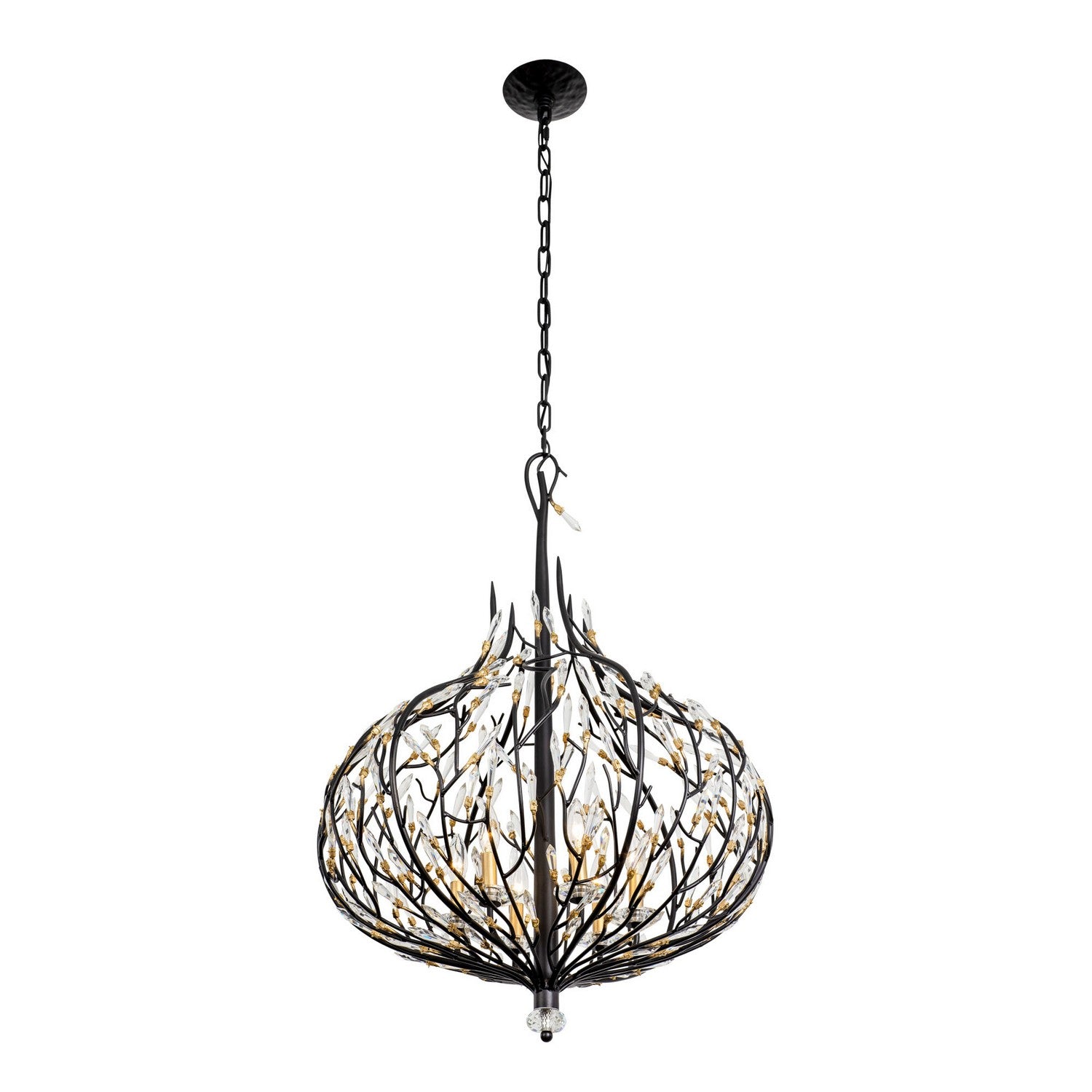 Bask is a unique crystal piece that melds together fashion influenced shapes and nature inspired details. Its pre-installed premium crystals and black with gold accents or gold dust finishes give duality with silvery sparkles and glimmering gold. This glamorous and whimsical collection is handmade using recycled steel and features unique elements, starting at the hand-hammered canopy. With stylishly sustainable choices like Bask, it's easy to see why Varaluz was the 2018 ARTS Awards Green Award Winner.