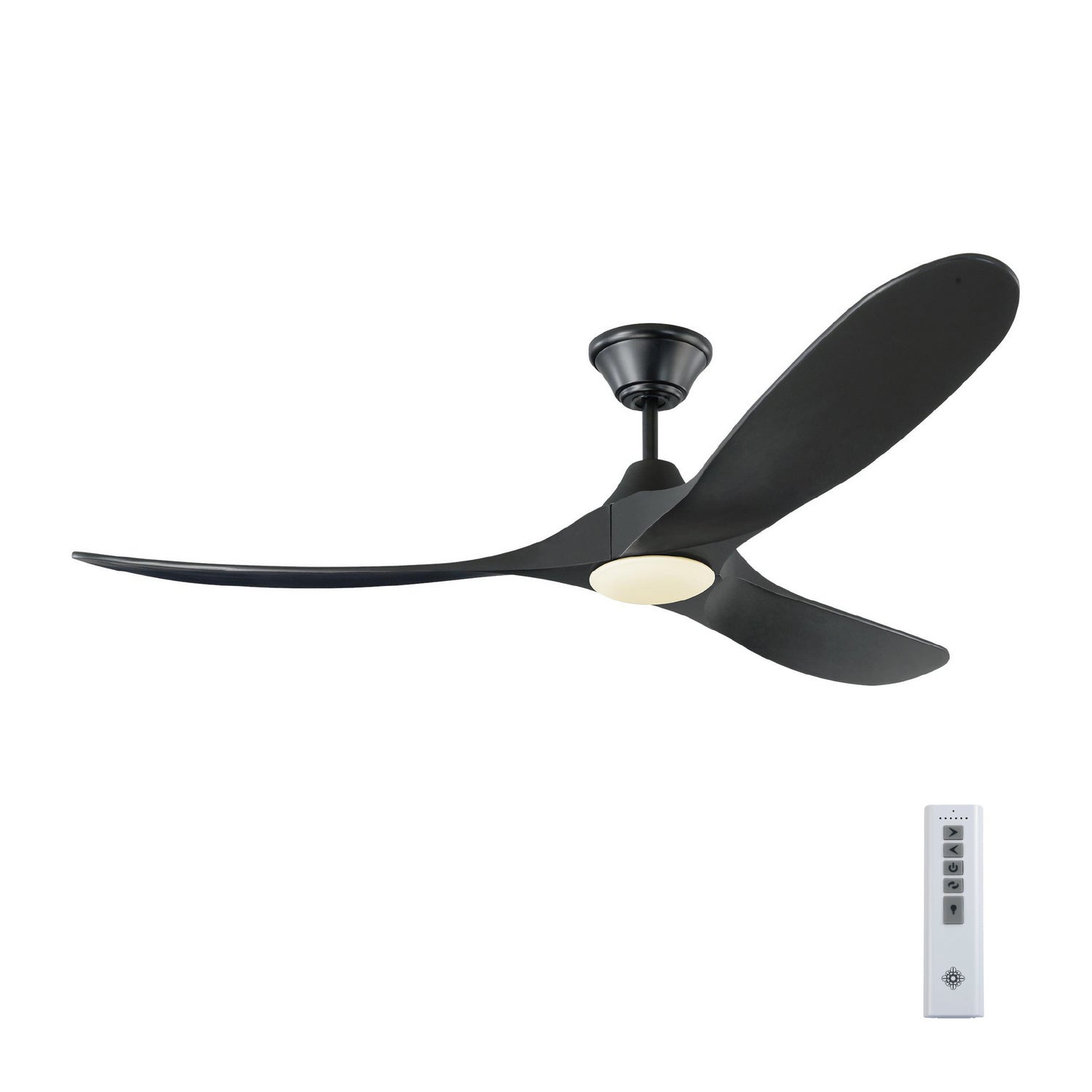The Maverick 60 LED in Matte Black w Matte Black Blades features an 85.0 X 28.0 6-speed motor with a Thirteen-degree blade pitch. The famous Maverick ceiling fan is now available with an integrated LED light. This advanced LED technology is carefully designed and selected to have the highest quality LED chipsets for superior performance and reliability. With a sleek modern silhouette, a DC motor, and super energy efficiency, the Maverick LED ceiling fan features softly rounded blades and elegantly simple housing. Maverick LED is available in 52, 60, and 70-inch blade sweep and a 3-blade design that delivers a distinct profile and incredible airflow for living rooms, great rooms, or outdoor covered areas. It includes a hand-held remote with six speeds and reverses. All versions feature beautiful hand-carved balsa wood blades. ENERGY STAR qualified. Maverick fans are damp-rated. A