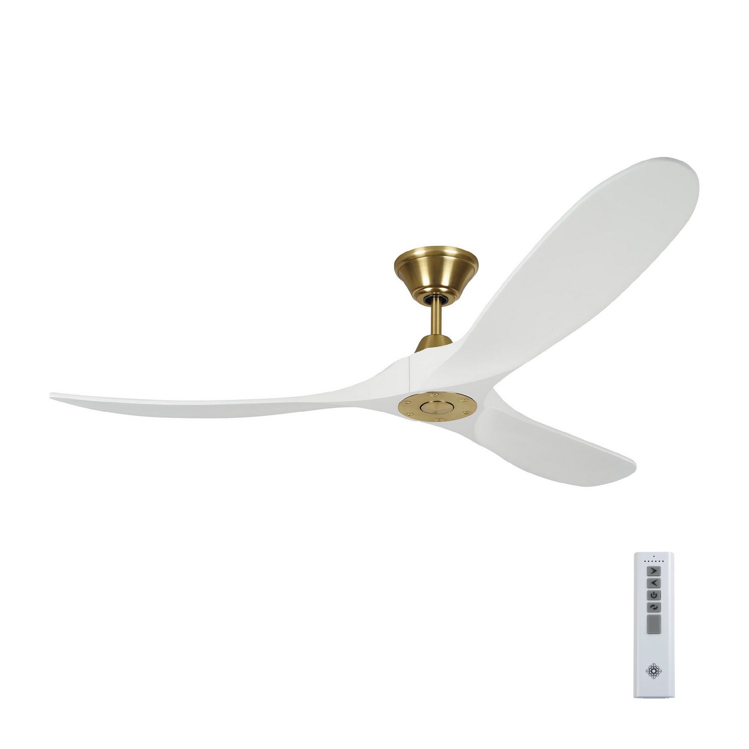 The Maverick 60 in Matte White w Burnished Brass features an 85.0 X 28.0 6-speed motor with a Thirteen-degree blade pitch. With a sleek modern silhouette, a DC motor, and super energy-efficiency, the 60" Maverick ceiling fan features softly rounded blades and elegantly simple housing. Maverick has a 60-inch blade sweep and a 3-blade design that delivers a distinct profile and incredible airflow for living rooms, great rooms, or outdoor covered areas. It includes a hand-held remote with six speeds. It reverses and is available in six distinct finish options: Brushed Steel housing with Dark Walnut blades, Brushed Steel housing with Koa blades, Matte Black housing with Dark Walnut Blades, Aged Pewter housing with Light Grey Weathered Oak blades, Matte Black housing with Matte Black blades and Matte White housing with Matte White blades. All versions feature beautiful hand-carved balsa wood blades. ENERGY STAR qualified. Maverick fans are damp-rated and may be used indoors and in covered outdoor spaces.