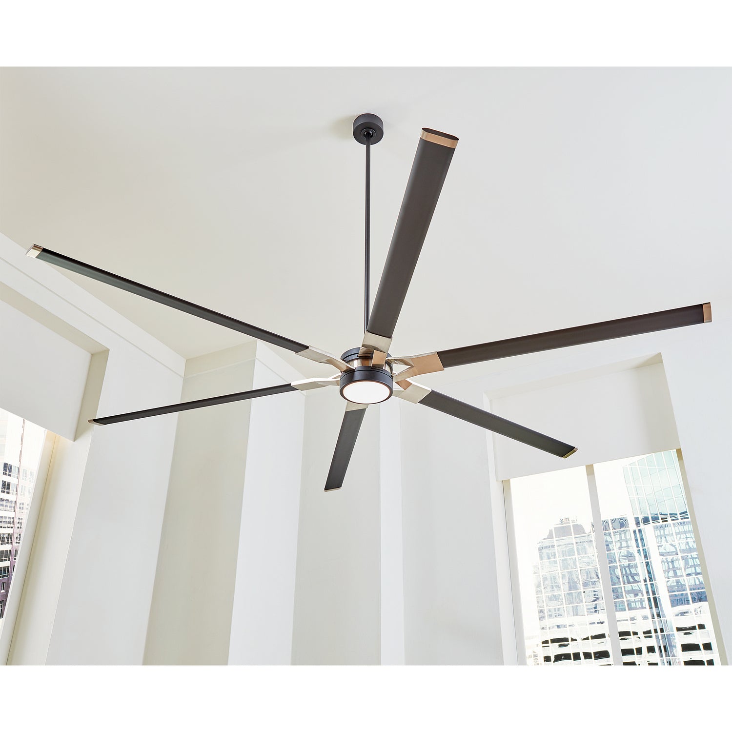 The Sean Lavin Loft 96 LED in Midnight Black features a 125.0 X 25.0 6 speed motor with a Thirteen degree blade pitch. With a unique split blade iron design, two-tone finish combinations and extruded aluminum blades, Loft is ideal for modern homes and commercial environments. The large-scale 96" fan has a powerful DC motor that uses minimal electricity and a bright white energy-saving LED downlight. Circulate air and create a strong ambient light base in your projects with Loft by Sean Lavin.