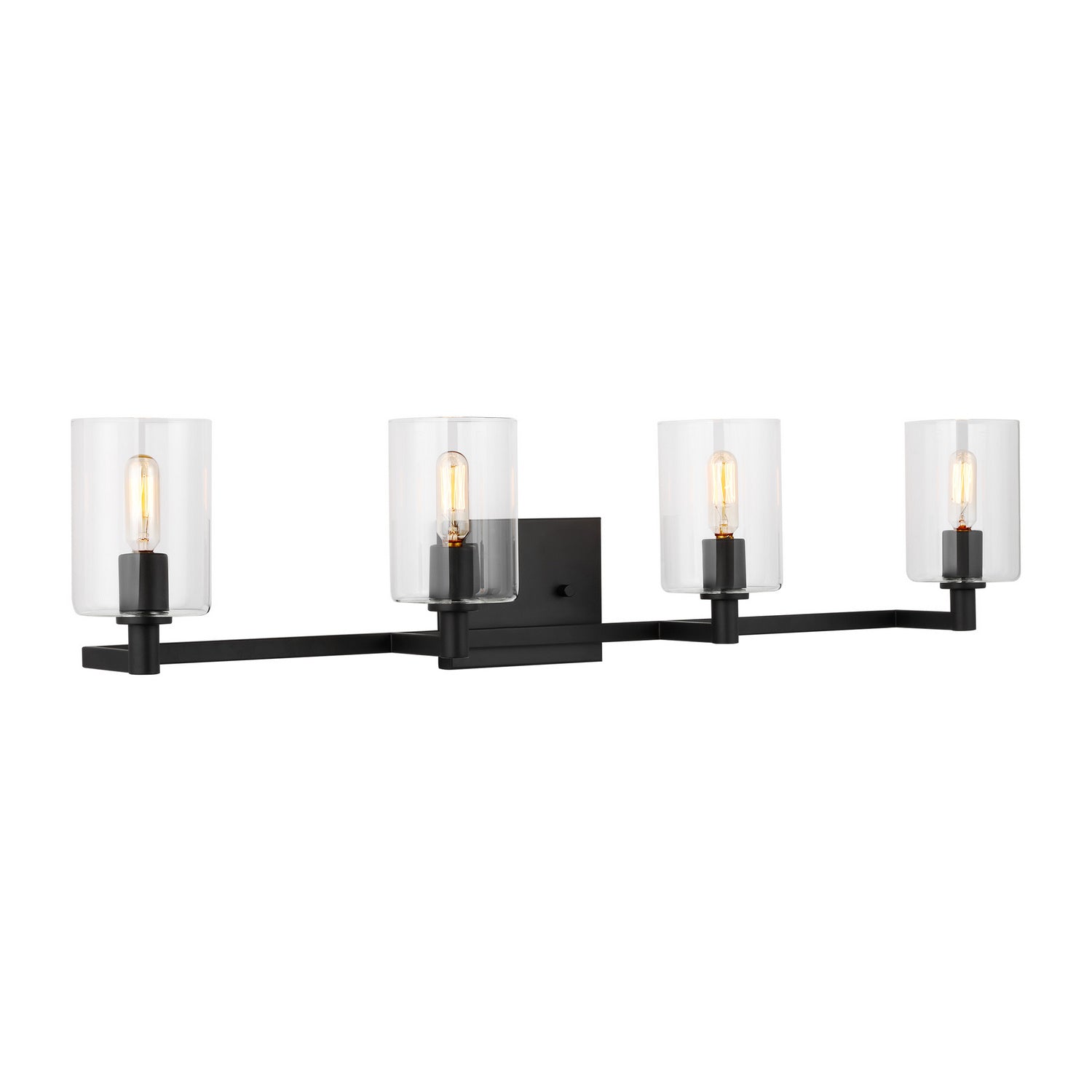 The Fullton four light vanity fixture in Midnight Black is sleek, contemporary, and uber minimalistic. Visual interest is created using a mix of rectangular and round frames, a subtle design detail. Although this collection is contemporary, it can be mixed in with variety of collections with ease.