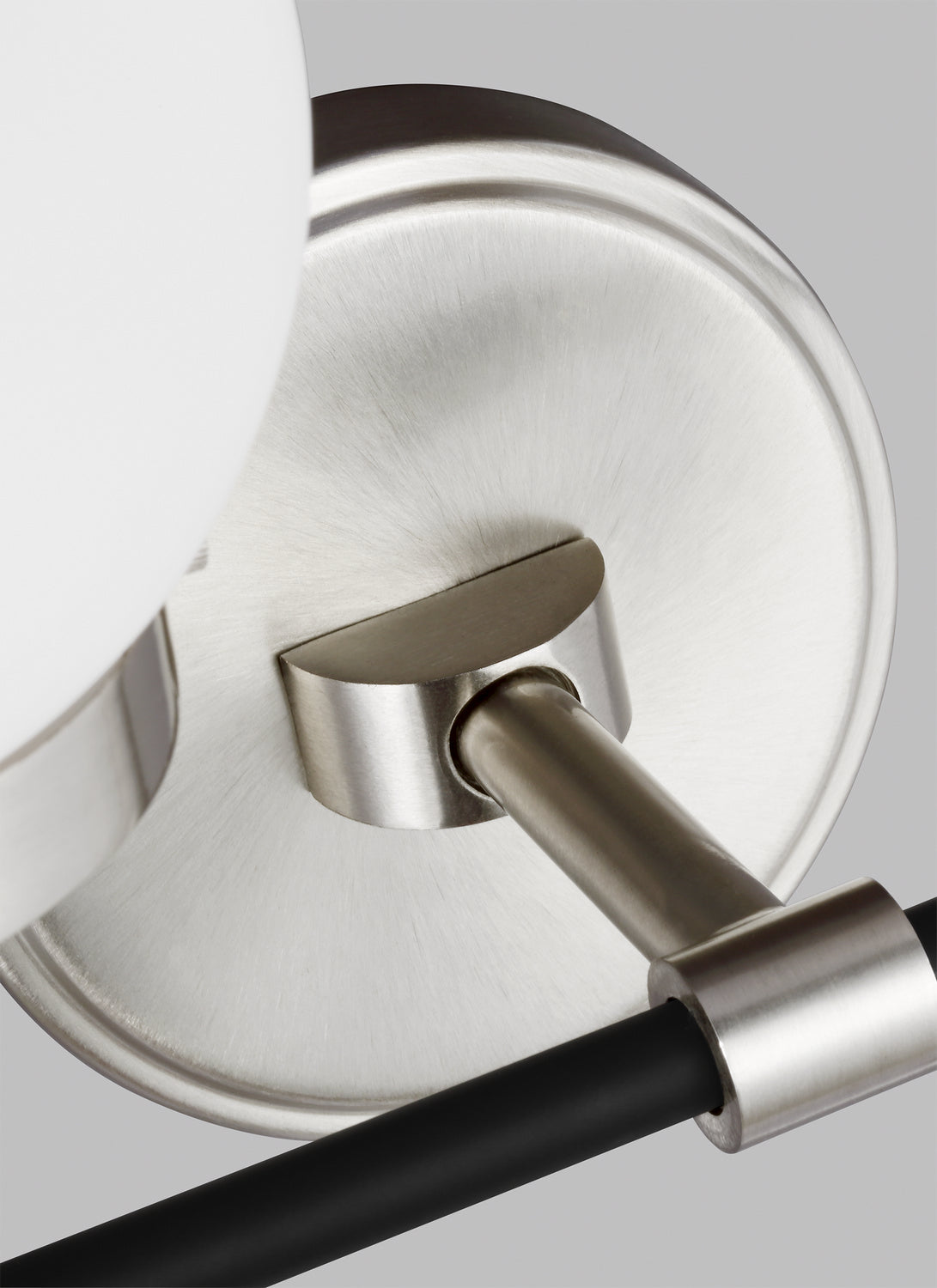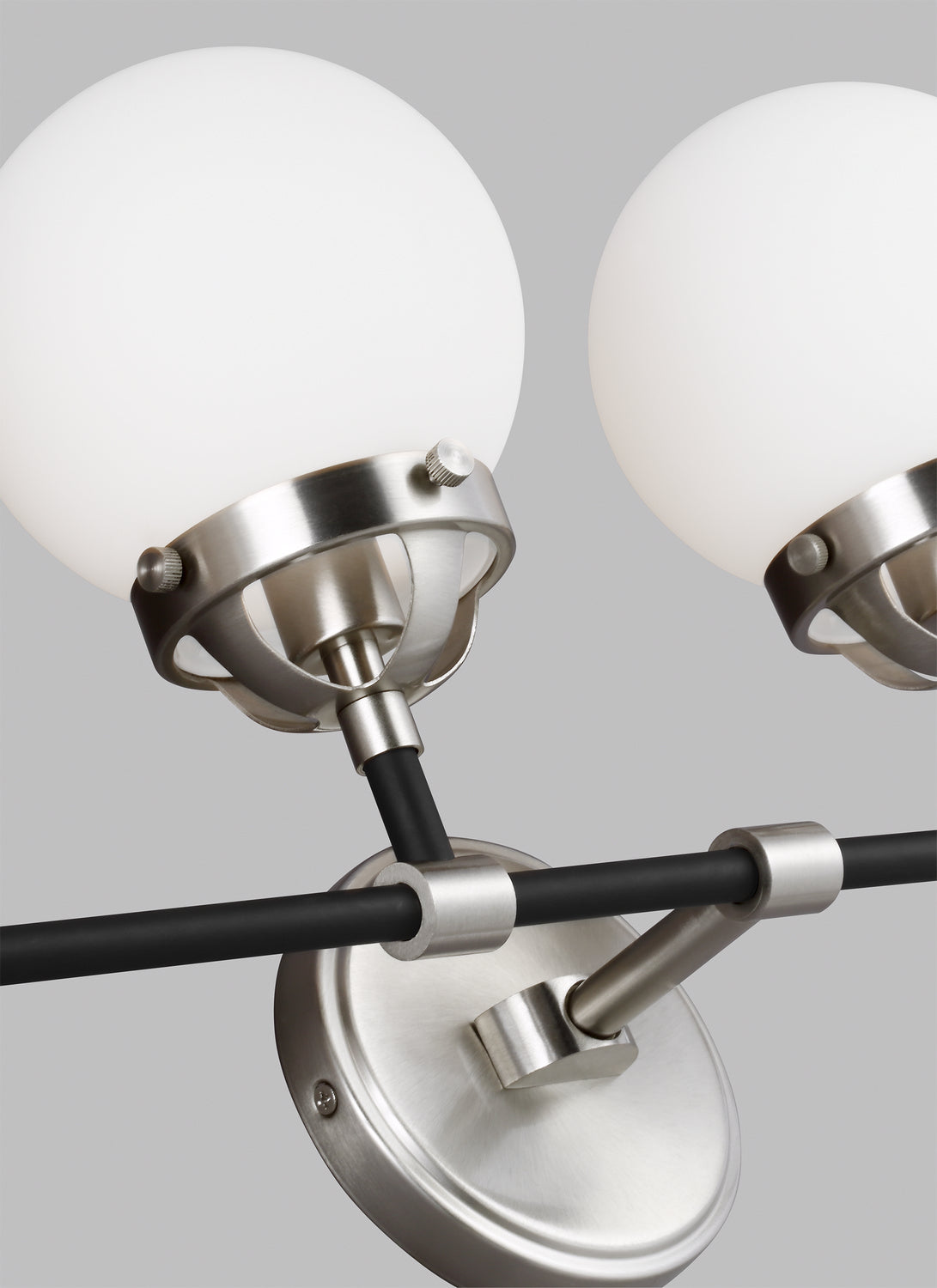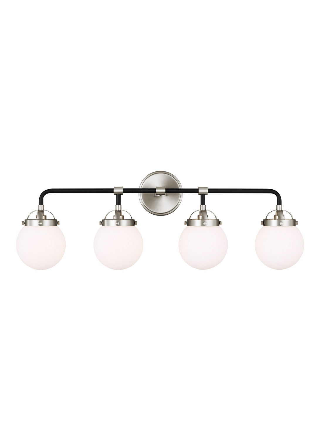 The Cafe four light vanity fixture in brushed nickel provides abundant light for your bath vanity, while adding a layer of today's style to your interior design. Handsome two-tone finish and white glass globe shades.