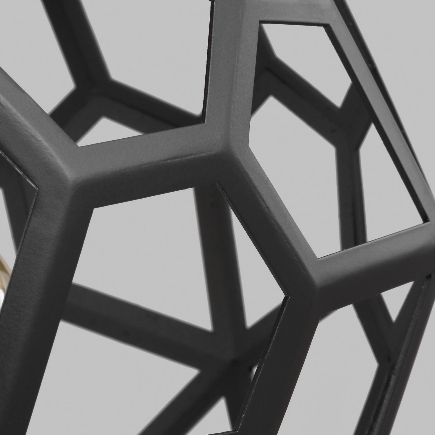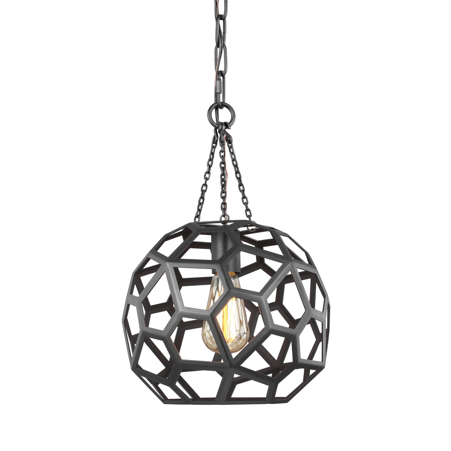 The Alexa Hampton Feccetta one light indoor pendant in midnight black is elegantly charming with a Mid-Century Modern appeal. The fixture is suspended by matching polished brass chain links, and both the shade and socket are held by three smaller chain links. The combination of its circular form with hexagonal shaped cut-out frame, illuminates light from any choice of lamping and can be elegantly placed as the focal point over an island or kitchen table. Alexa Hampton is an industry force who honors tradition and commits to the future, providing smart, stylish, design-rich solutions for every aspect of the home.