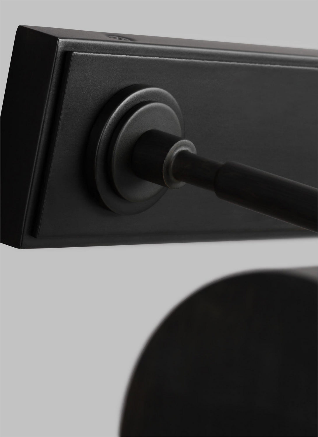 The Kenyon 30" Picture Light by Chapman & Myers were designed to be highly versatile in their application, at home in any interior. They have classic half round pharmacy shades which are mounted to a cylindrical metal stem with a differentiated stepped detailing. The picture lights have an architecturally inspired medallions where the arms mount to the rectangular backplate. Kenyon has a smooth clean metal shade that will bring the perfect light to your works of art. Available finishes include Aged Iron and Burnished Brass.