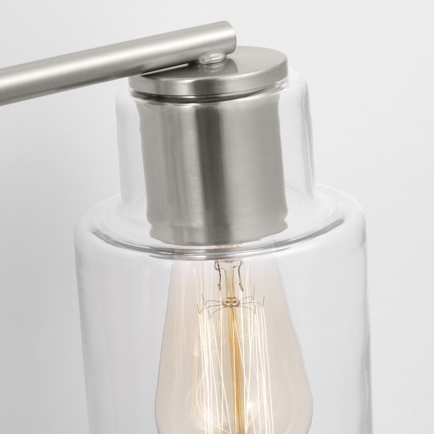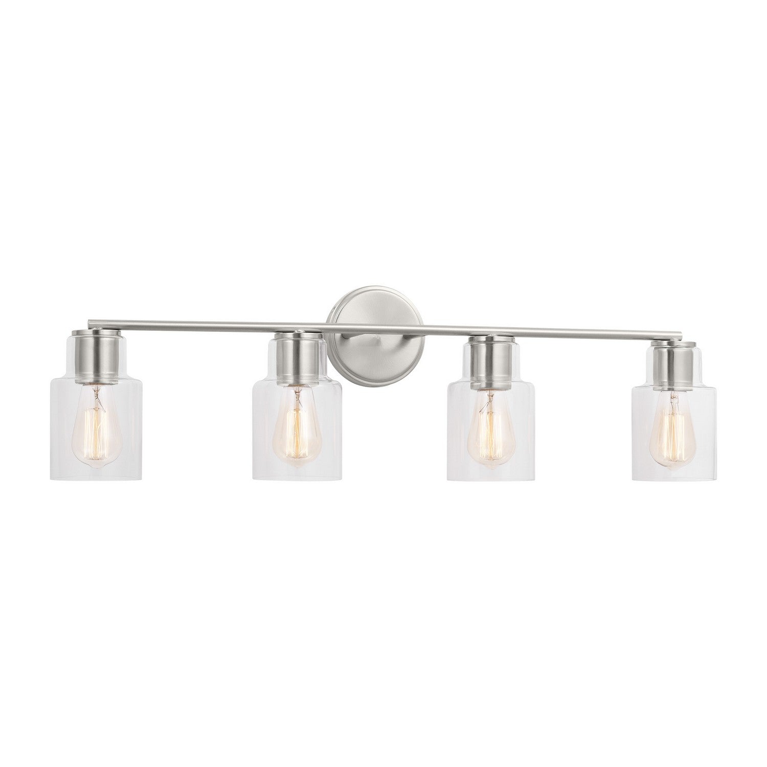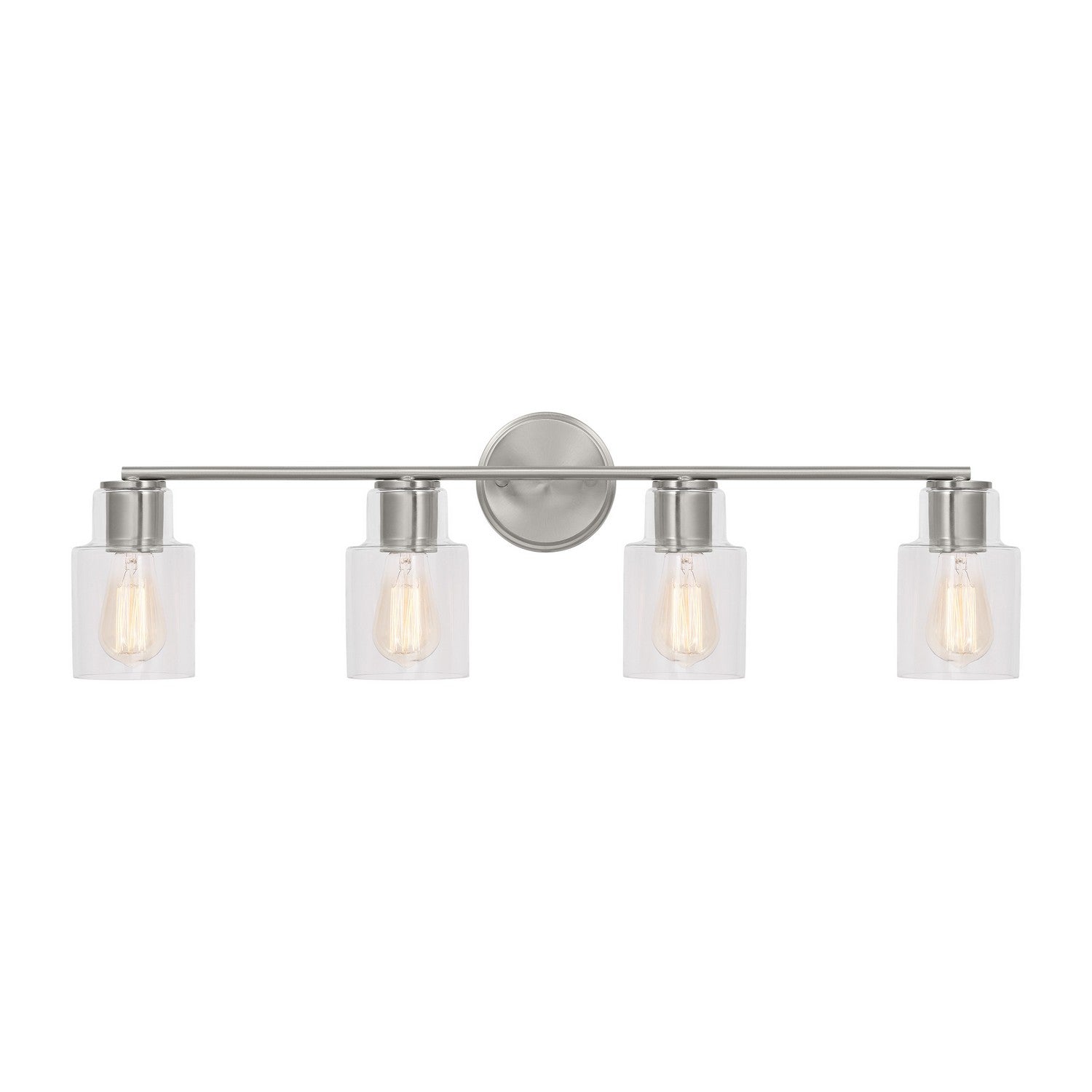 Add a bright burst of light where you need it most with the classic Drew & Jonathan Sayward Four Light Wall / Bath Sconce, featuring a round metal backplate and clear glass shades. Made to coordinate across a broader range of bath hardware and design styles, the Sayward is available in four popular finishes, Brushed Steel, Chrome, Midnight Black, and Satin Brass. This light looks great on its own or installed above a bathroom vanity, and the glass shades make it ideal for filament bulbs. This fixture may be mounted in the up or down position, and is cETL listed for damp locations, making it the perfect lighting solution for any space.