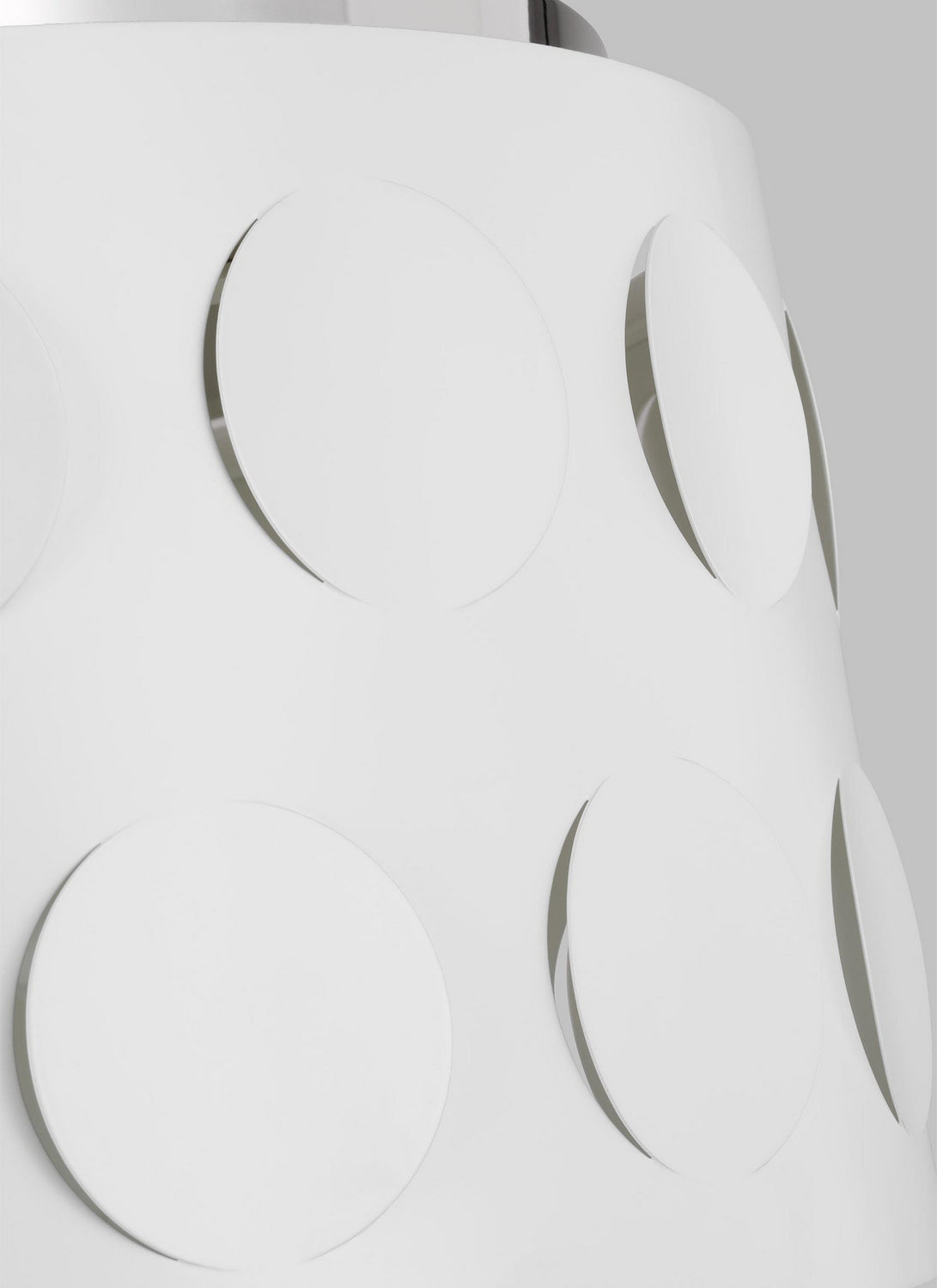 Dots are iconic to the kate spade brand—a simple and playful graphic motif. Dottie takes an iconic kate spade dot motif and cuts it into metal—creating a playful ambient light effect. A classic metal drum shade with an extra twist of perforated pattern. A matte white steel shade with an etched glass diffuser creates a gentle muted glow. Ideal for any hallway, foyer, bedroom, bathroom, or wherever overhead illumination is needed in transitional settings.