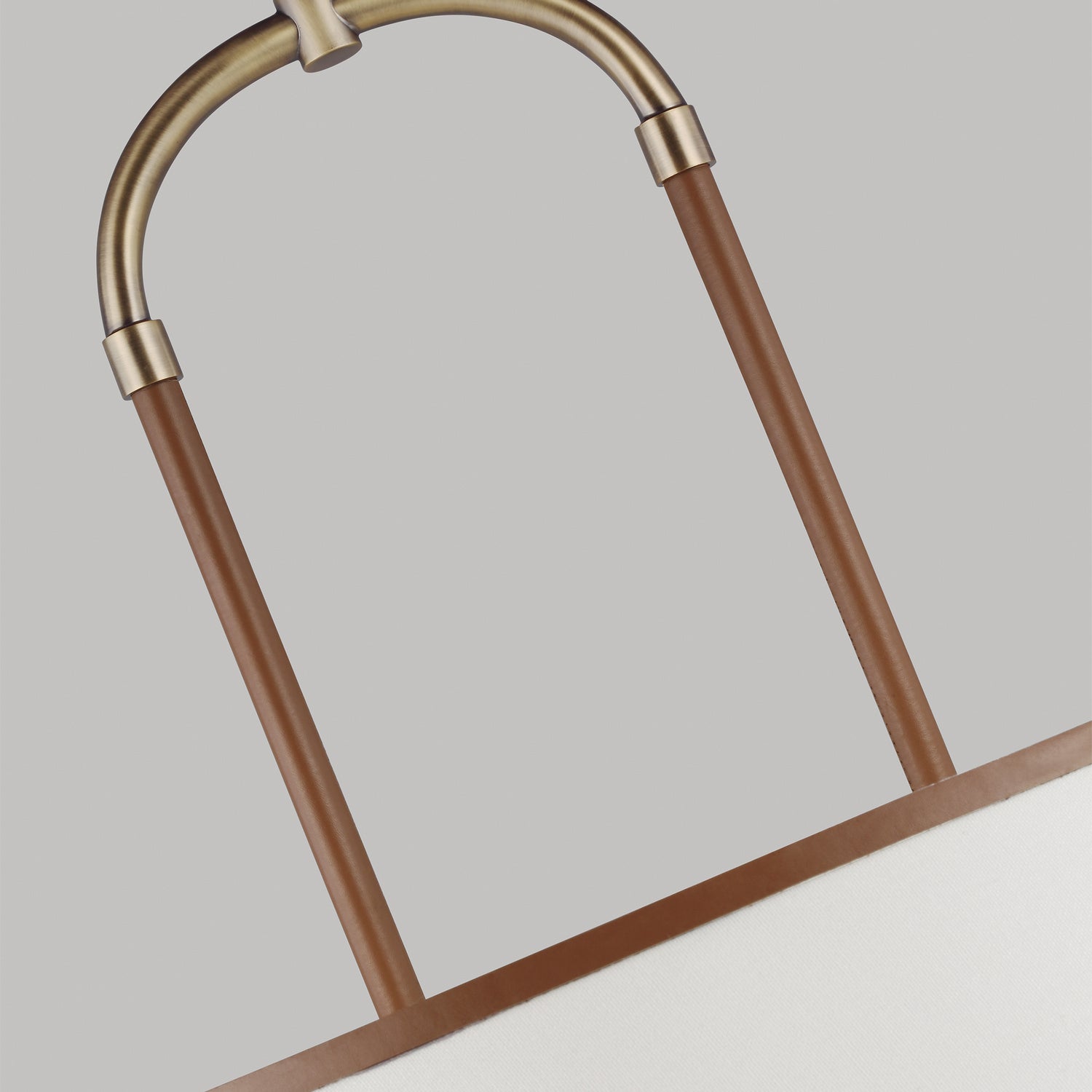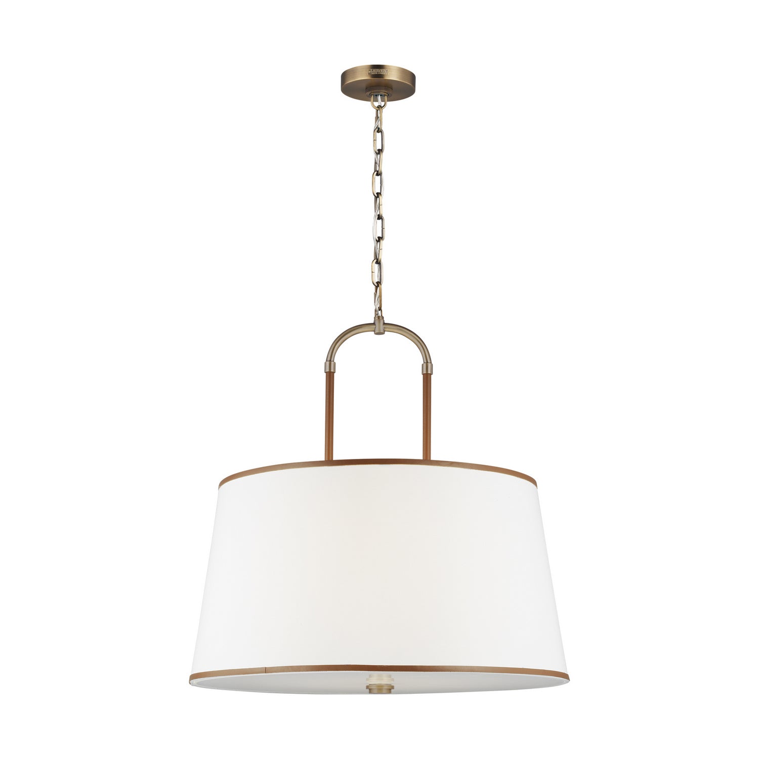 The Katie four-light shade pendant leather straps contrast with metal and white linen fabric shade to round out a timeless design. Available in: Time Worn Brass with Brown Leather or Polished Nickel with Black Leather. The combination of leather and steel gives this round chandelier equestrian flair.