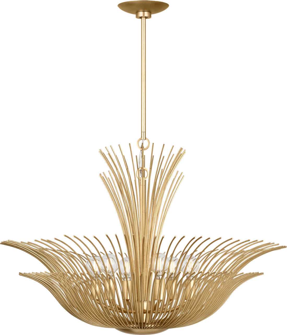 The Dorelle 28 Chandelier by Christiane Lemieux is a sculptural statement born of French modernism's golden age—when glamour was architectural and metalwork borrowed the elegance of couture. Inspired by the ateliers of 1930s and 40s Paris, its sinuous, palm-like arms recall the organic forms of Jean Royère and the feathered coronas of Art Deco jewelry, while fluted brass detailing nods to Jean-Michel Frank's interiors. Nature, fashion, and architecture converge in a design that feels both organic and precise: a golden bloom suspended midair. Hand-gilded and finished with layered tones that glow like antique jewelry under candlelight, this 28-inch chandelier brings warmth and quiet drama to dining rooms or entryways without ostentation. Crafted for contemporary interiors yet rooted in history, Dorelle reinterprets the optimism and artistry of interwar Paris for modern spaces—an heirloom piece defined by proportion, texture, and light.