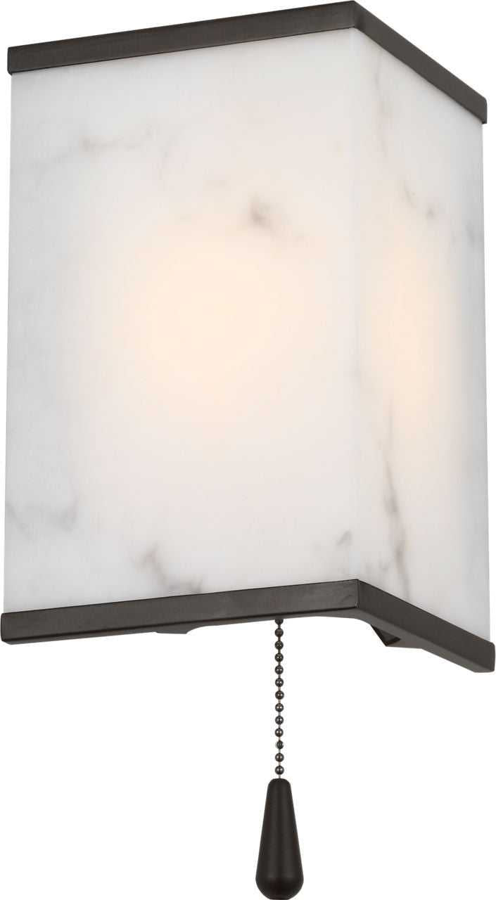 The Cleor 8 Sconce by Christiane Lemieux takes its name from Clé d'or—the "golden key" to refined illumination. Inspired by the pared geometry and quiet glamour of 1930s Parisian interiors, this design transforms the wall plane into an illuminated sculpture. Its rectangular volume of faux alabaster—a sustainable alternative that mirrors the veining of natural stone—diffuses a calm, ambient glow, while the burnished brass and aged iron frame introduces architectural gravitas and tactile warmth.