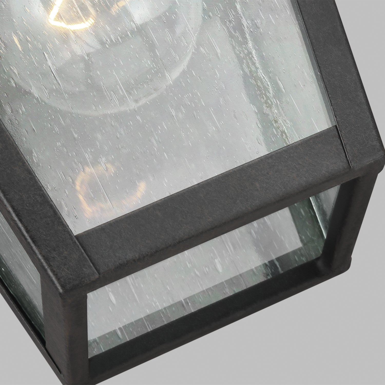 The Sean Lavin Galena one light outdoor wall fixture in sable creates a warm and inviting welcome presentation for your home's exterior. Galena is a Europe-inspired classic lantern. Simple and refined, Galena features a gently curved hook detail atop a vented, square-off roofline, and candle tubes floating within the tapered Clear Seeded glass shades. Galena is a warm, welcoming silhouette offered in our NEW Sable finish.