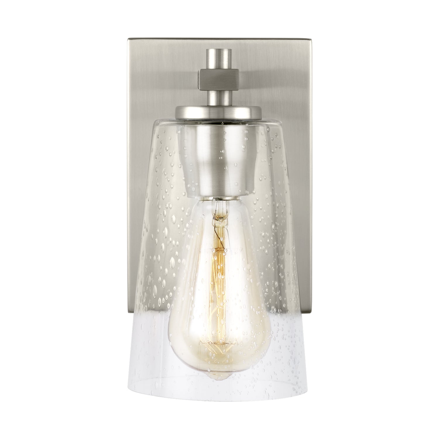 The Sean Lavin Mercer one light wall sconce in satin nickel offers shadow-free lighting in your powder room, spa, or master bath room. Modern details, like the clean square supports of the cross arm and sleek, rectangular backplate, are defining features of the Mercer. Choose from either refreshingly bright Chrome or warm, rustic Oil Rubbed Bronze hardware for a distinct look, both with tapered Clear Seeded glass shades that complete the tailored look.