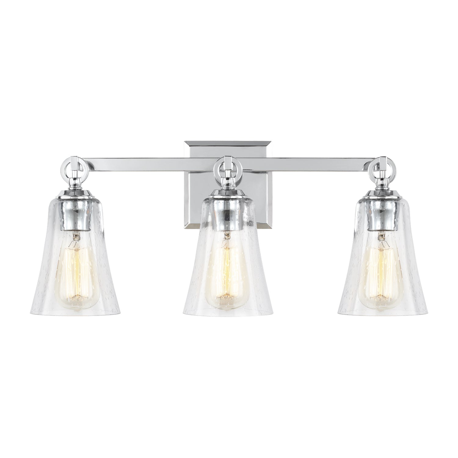 The Sean Lavin Monterro three light vanity fixture in chrome offers shadow-free lighting in your powder room, spa, or master bath room. Monterro features beautiful tapered glass shades and exquisite cast details, including a cast backplate, cast ring, and hook hardware that elegantly supports the shades. The Chrome version is available with two glass options, either White Opal Etched glass or Clear Seeded glass, while the Burnished Brass, Satin Nickel finish is available in Clear Seeded glass only.