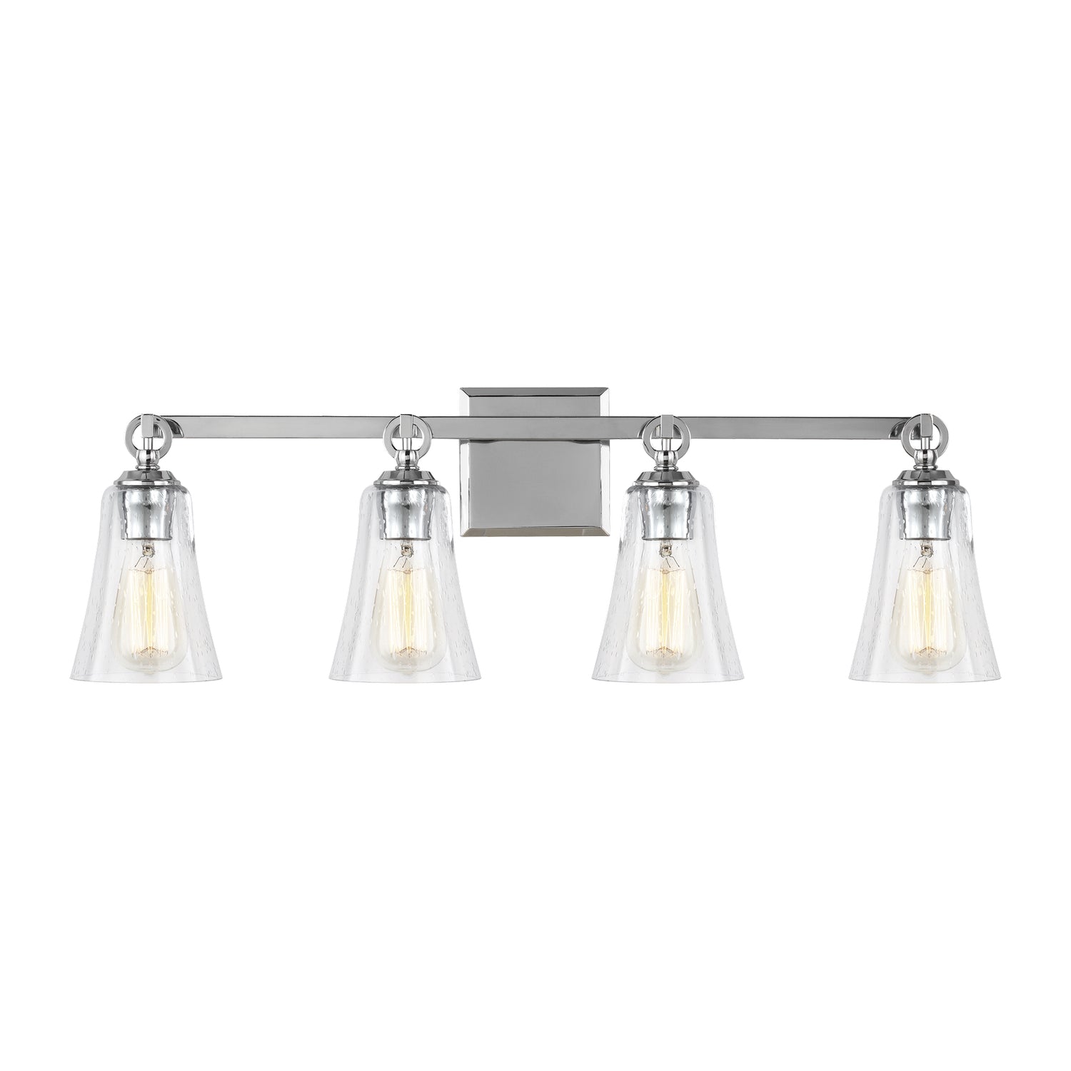 The Monterro four light vanity fixture in chrome provides abundant light for your bath vanity, while adding a layer of today's style to your interior design. Monterro features beautiful tapered glass shades and exquisite cast details, including a cast backplate, cast ring, and hook hardware that elegantly supports the shades. The Chrome version is available with two glass options, either White Opal Etched glass or Clear Seeded glass, while the Burnished Brass, Satin Nickel finish is available in Clear Seeded glass only.