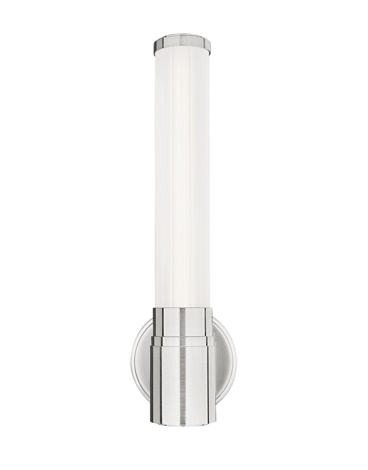 A torch-inspired silhouette pairs with delicately ribbed glass in this modern LED wall sconce. A chic choice for an entry, living area or bath, it boasts an integrated LED that's dimmable and energy efficient, while showcasing a cool brushed nickel finish that complements in any setting.