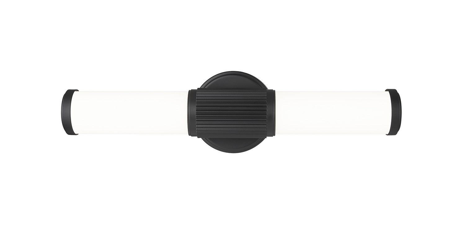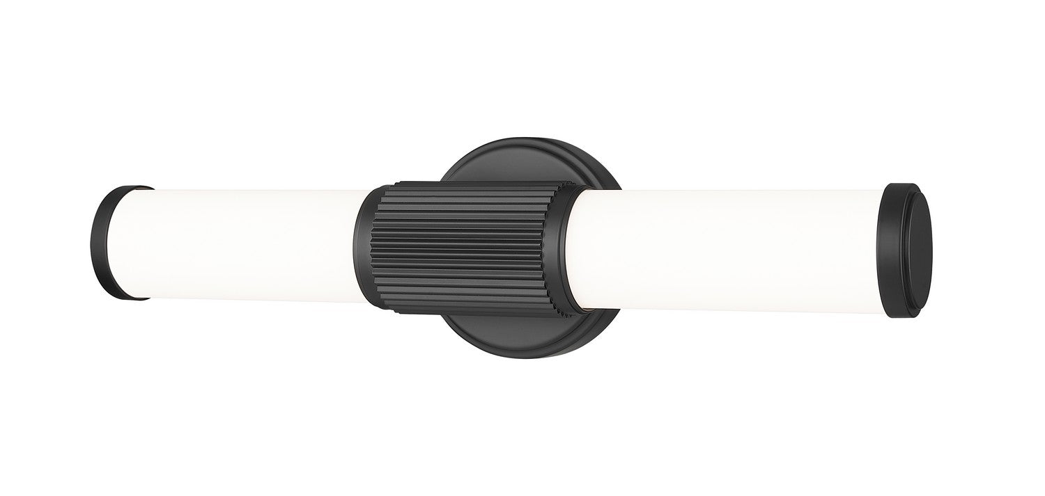 Textural contrast and a smooth matte black finish are an eye-catching combination for this modern LED vanity bath light. A pair of opal glass cylinder shades create bright, indirect illumination, while the energy efficient LED is ideal for contemporary homes. The fixture's steel frame boasts a beveled wall plate and decorative end caps, with a fluted cuff that brings an artistic touch you're going to love.