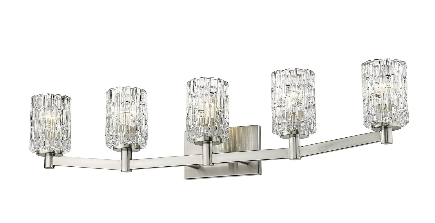 A contemporary haven is bejeweled with glam as this exquisite five-light vanity light becomes a focal point in a modern bath space. Crystal-like glass shades add an air of exclusivity to a fixture with a beautiful Brushed Nickel finish metal mount and arms, and an air of high-class, upscale elegance that frames a decadent vanity.