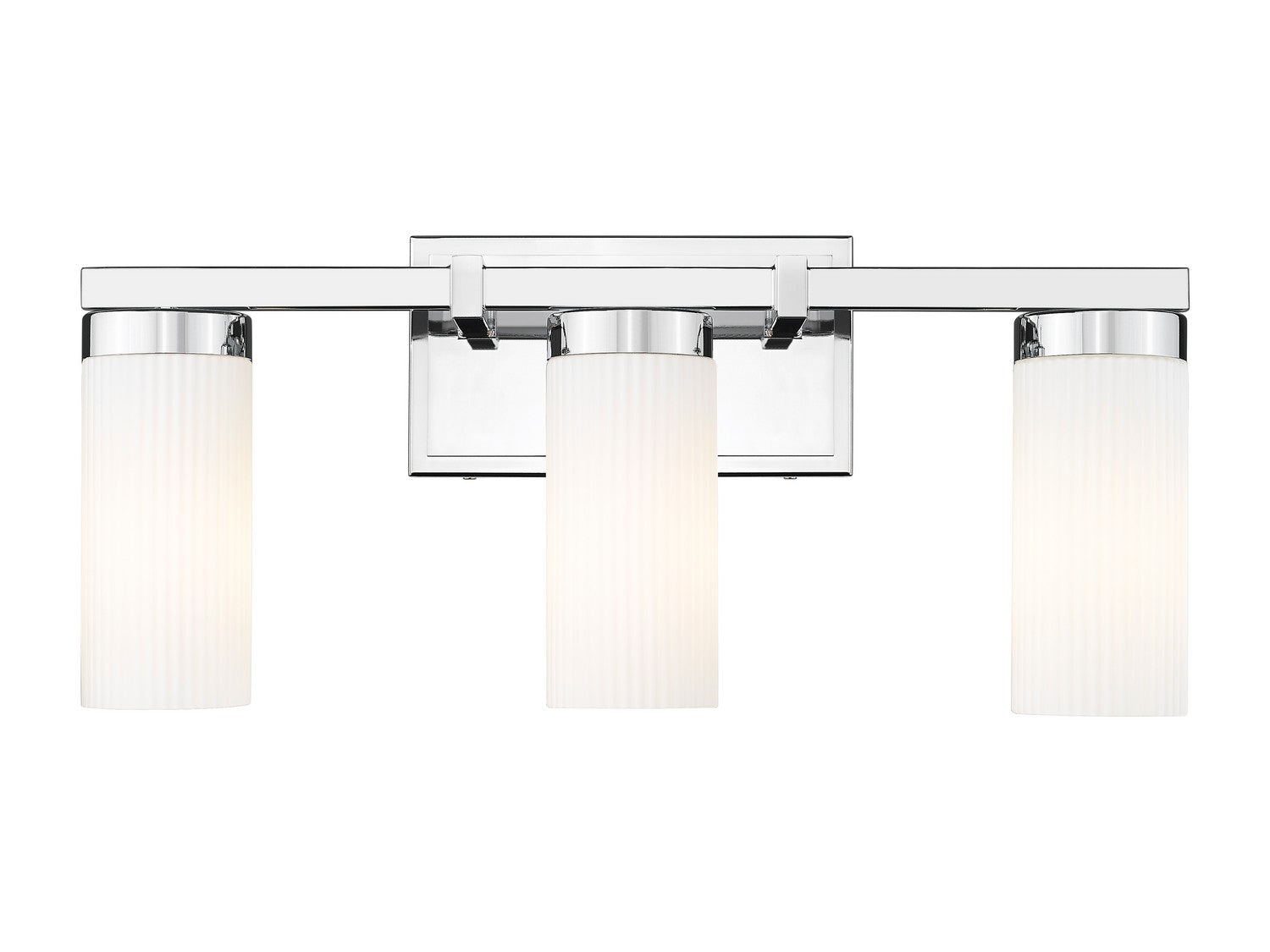 This chrome vanity light balances modern shine with timeless detail across three softly glowing ribbed glass shades. The sleek backplate anchors the look with crisp geometry and a cool, reflective edge. It's an elegant upgrade for any vanity that could use a bit of clarity and style.