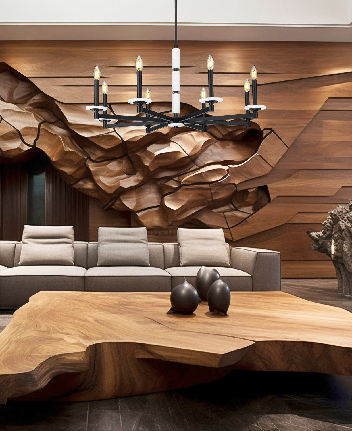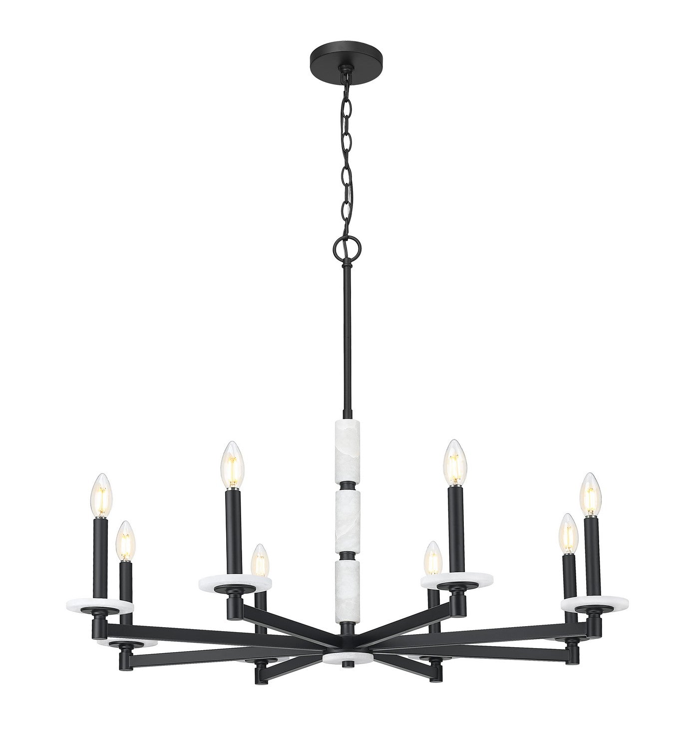 This chandelier brings bold elegance to the heart of the room. Eight alabaster spheres circle a matte black frame, offering contrast and glow in perfect measure. With its sculptural layout and soft light, it's made to captivate.